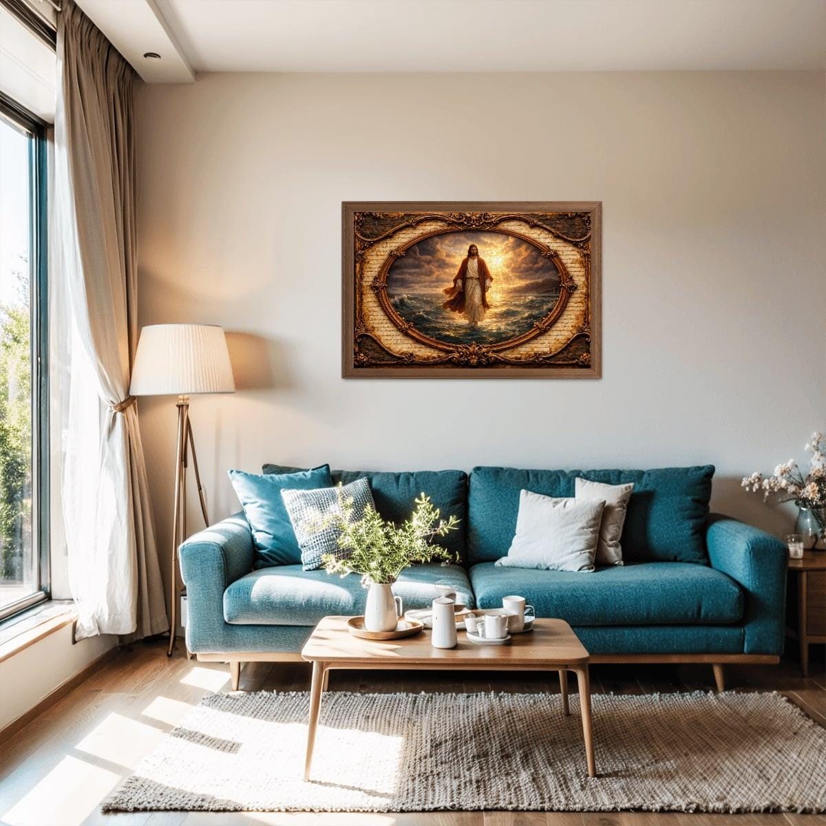Reflect on faith and hope with this inspiring Jesus Walking on Water Wooden Puzzle. The artwork shows Jesus standing peacefully above the waves as light shines through the clouds, creating a powerful and uplifting scene framed in a beautiful vintage design.