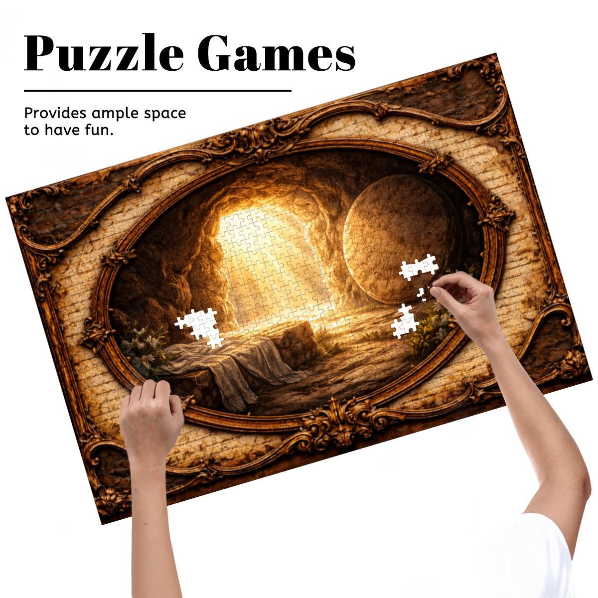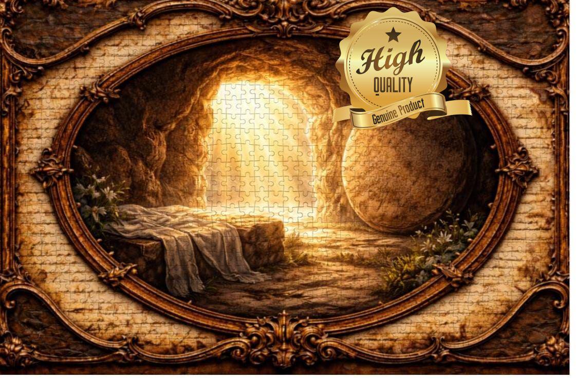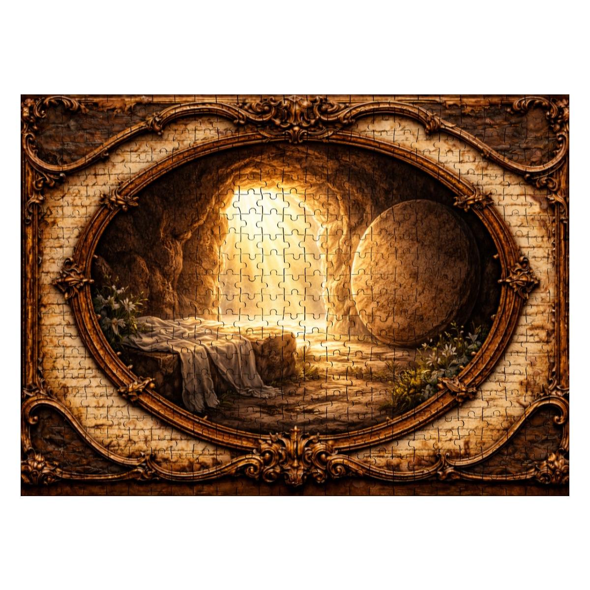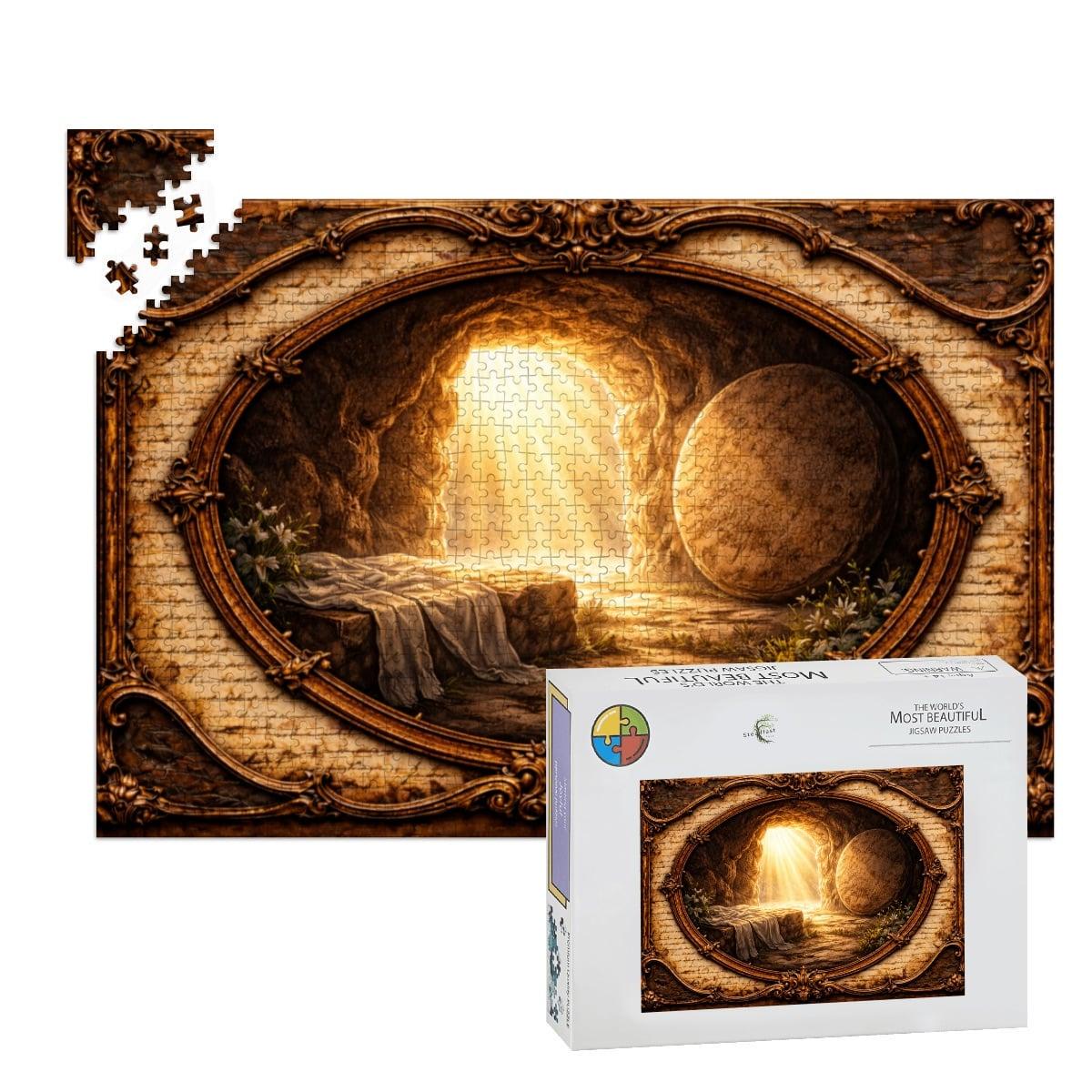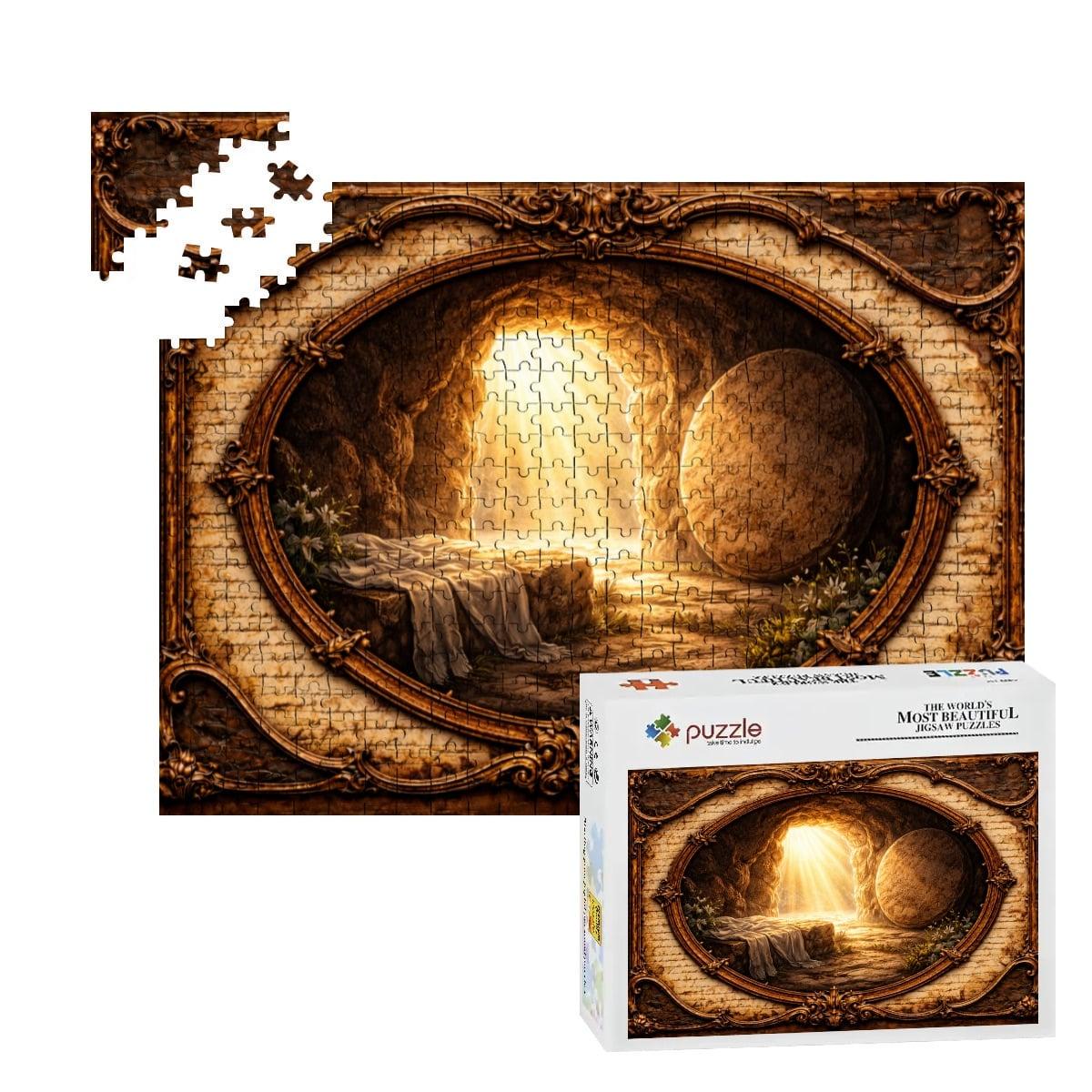 Golden light pours from the open tomb entrance, illuminating the surrounding landscape and creating a peaceful yet powerful scene of faith and renewal. The artwork is framed in a vintage-style oval design that gives the puzzle a timeless and meaningful look.