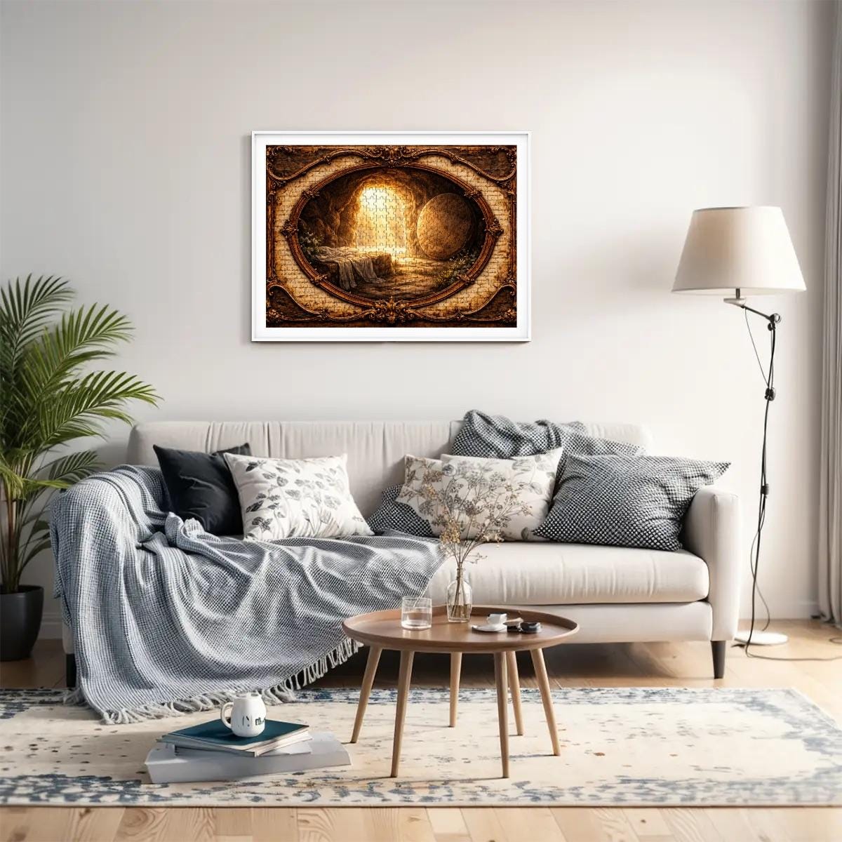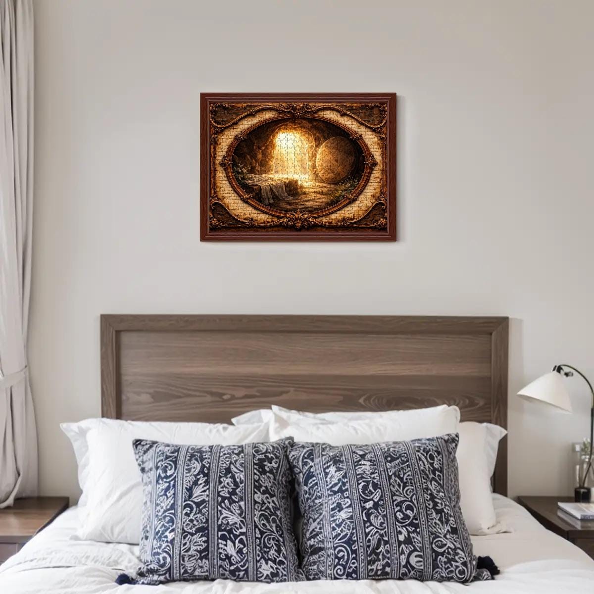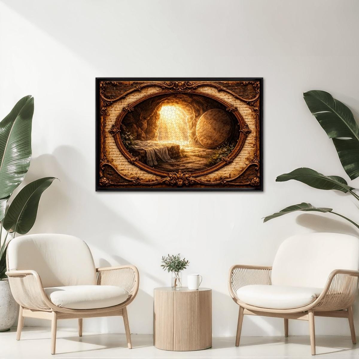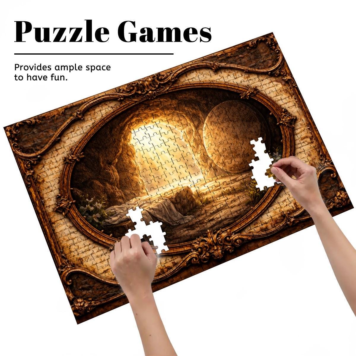Golden light pours from the open tomb entrance, illuminating the surrounding landscape and creating a peaceful yet powerful scene of faith and renewal. The artwork is framed in a vintage-style oval design that gives the puzzle a timeless and meaningful look.