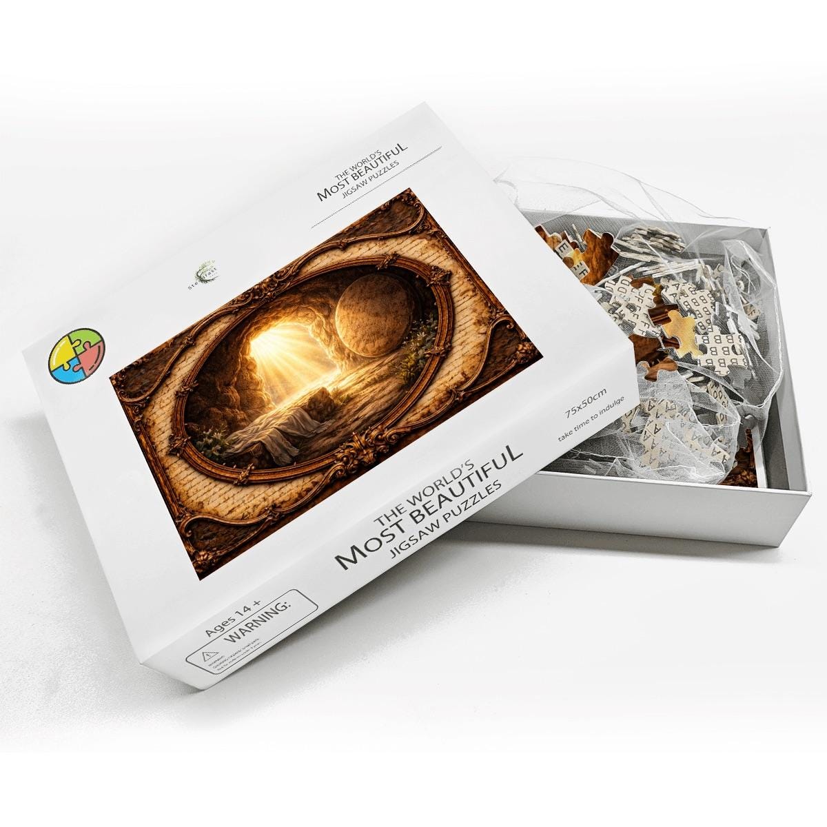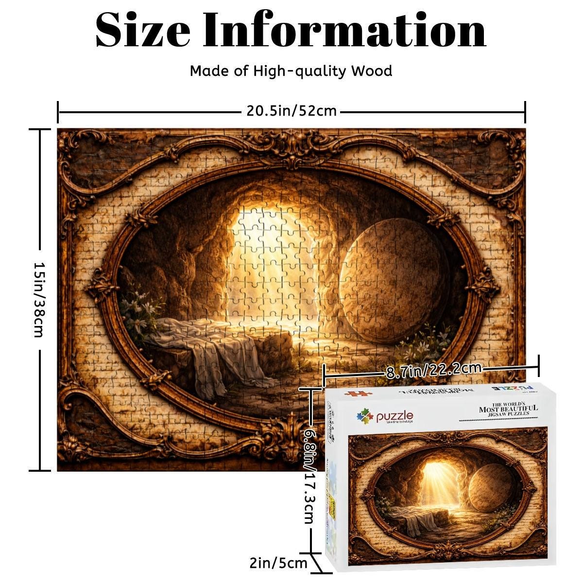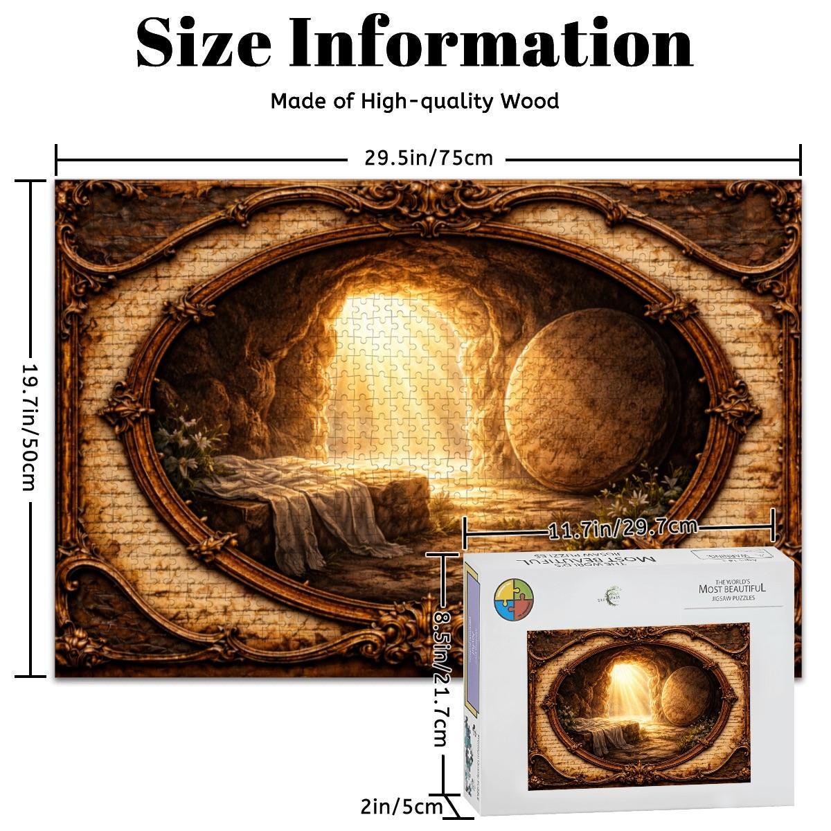 Celebrate the hope and victory of the Resurrection with this beautiful Empty Tomb Resurrection Wooden Puzzle. The artwork captures the powerful moment when the stone is rolled away from the tomb and light shines outward, symbolizing new life and the risen Christ.