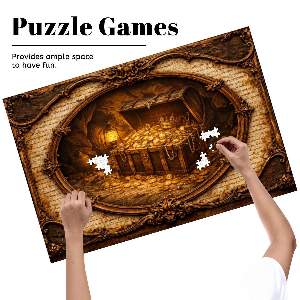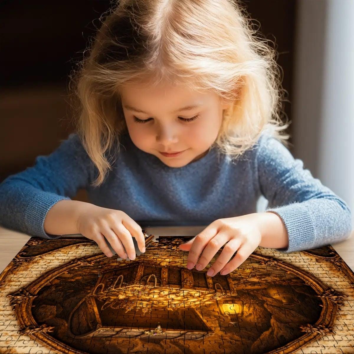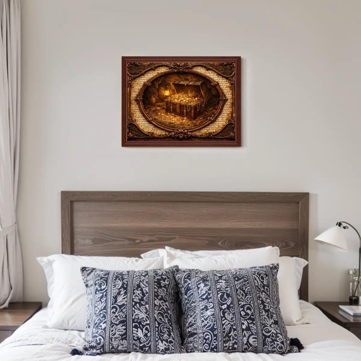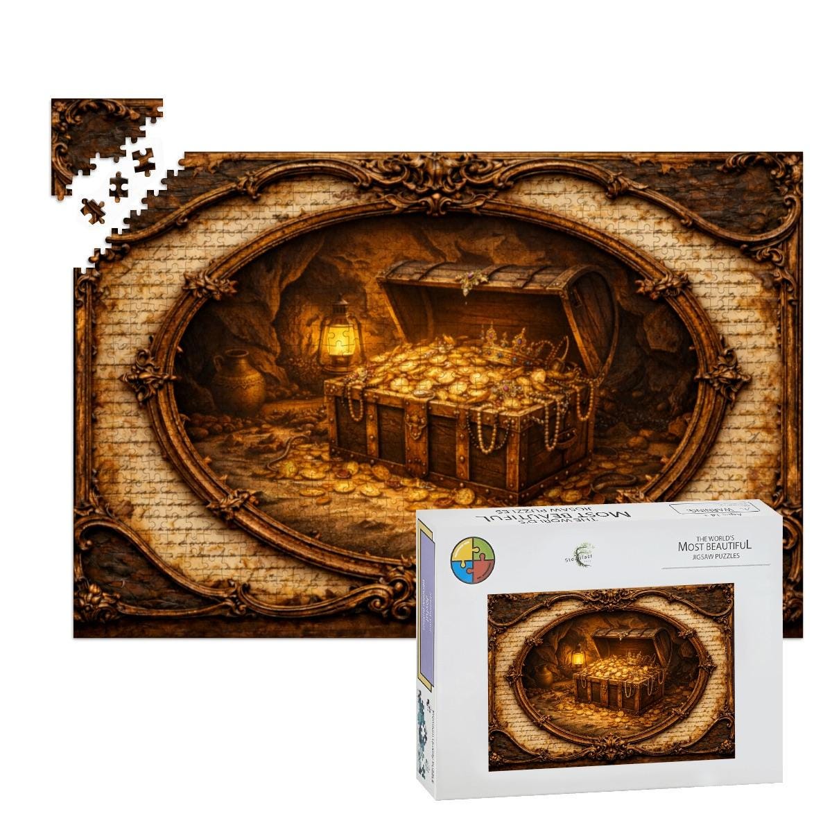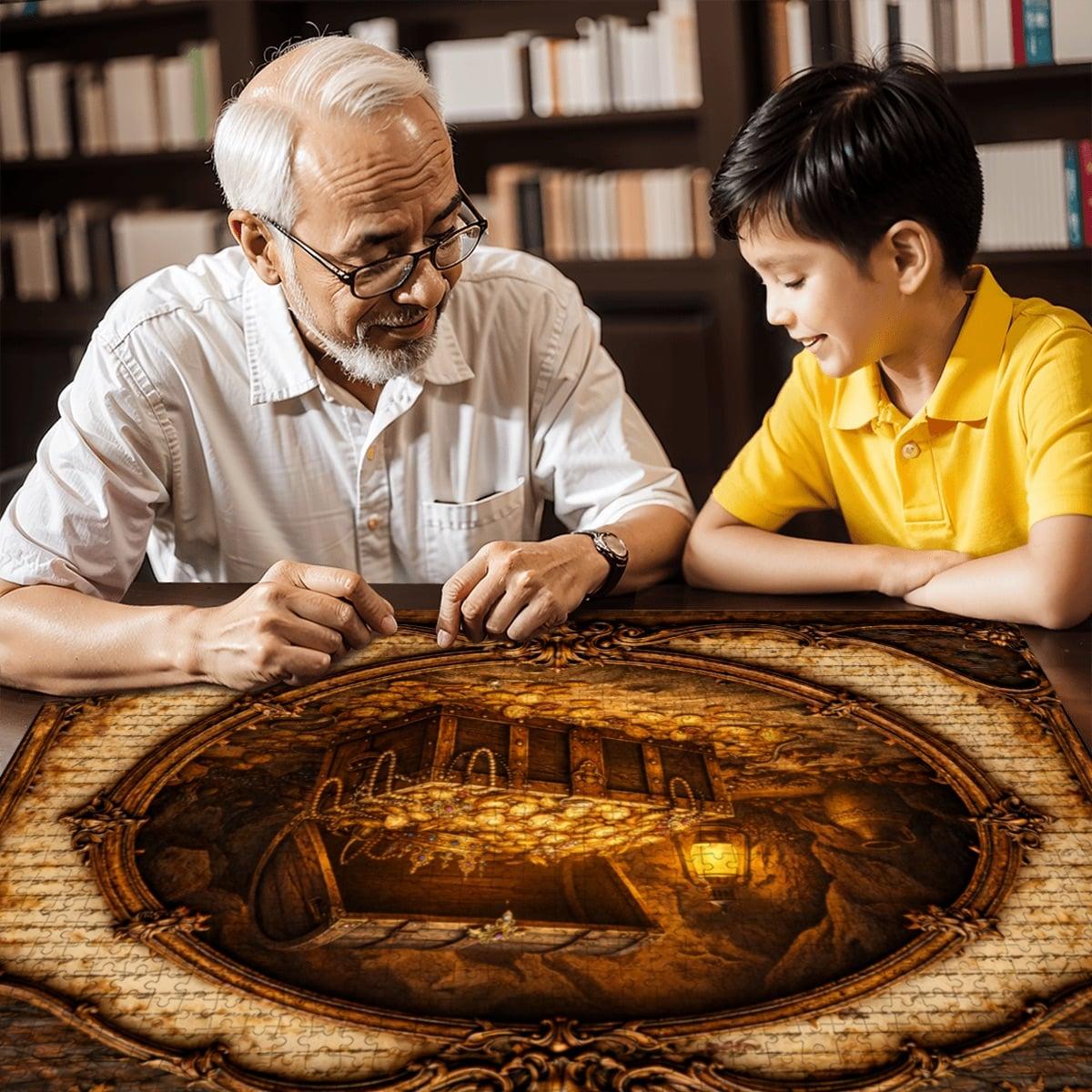 The rich golden tones and detailed vintage-style frame create a dramatic and adventurous scene that puzzle lovers will enjoy assembling piece by piece. This design captures the feeling of discovery and mystery, making it a fun and engaging puzzle experience.