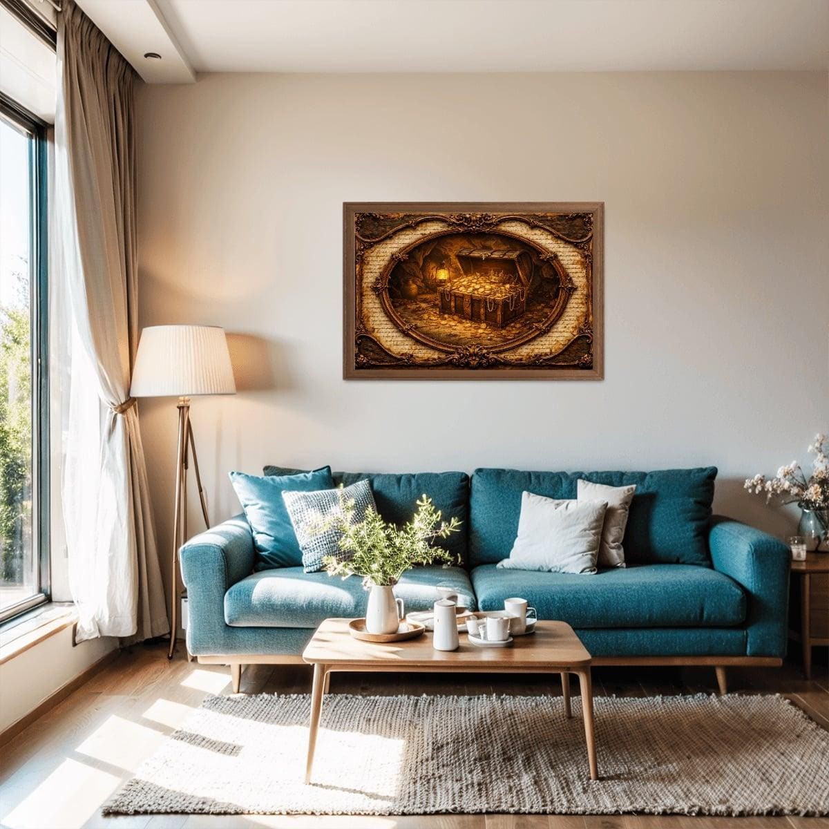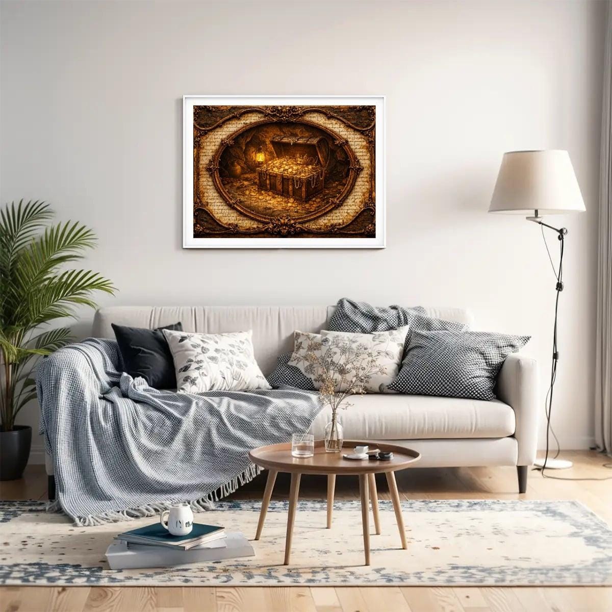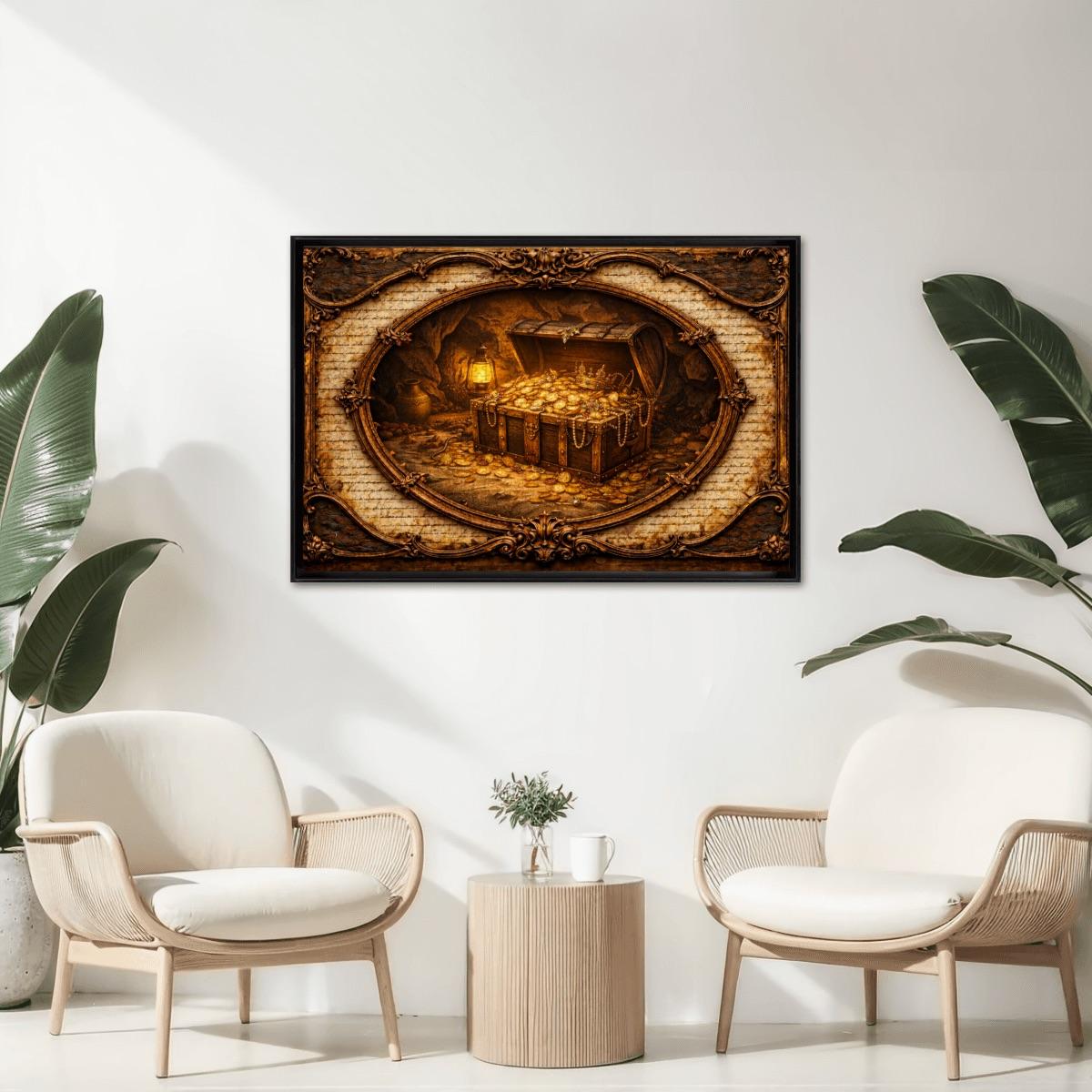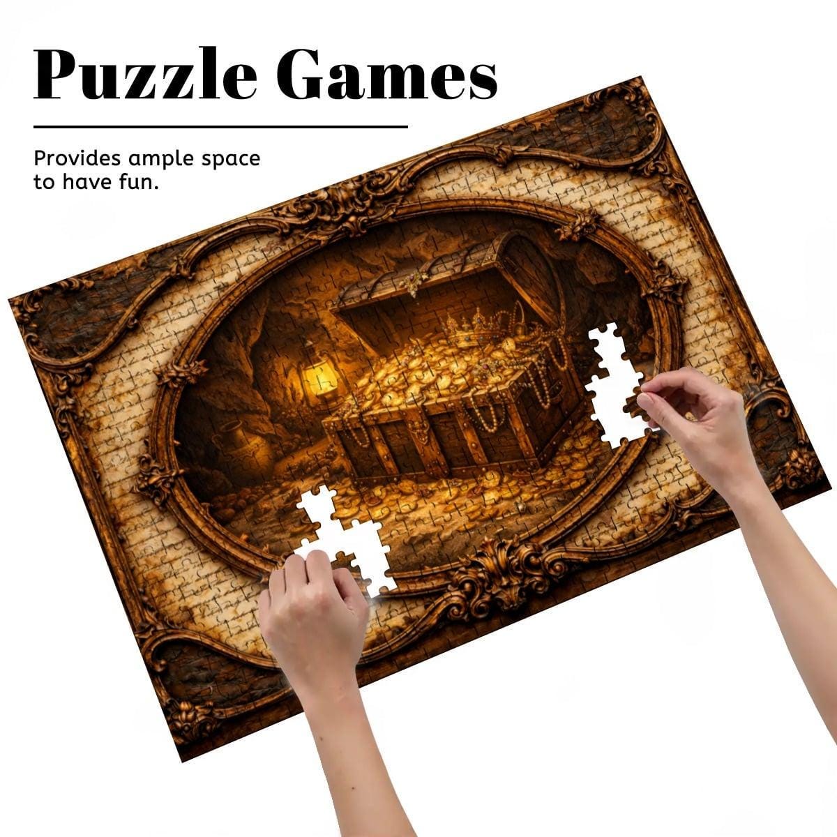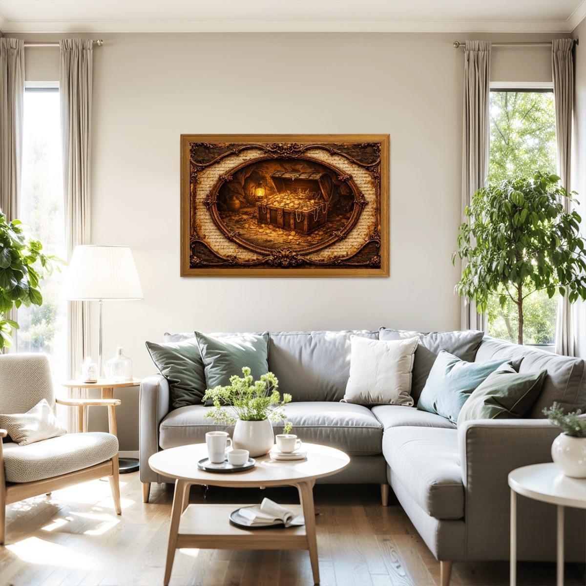 The rich golden tones and detailed vintage-style frame create a dramatic and adventurous scene that puzzle lovers will enjoy assembling piece by piece. This design captures the feeling of discovery and mystery, making it a fun and engaging puzzle experience.