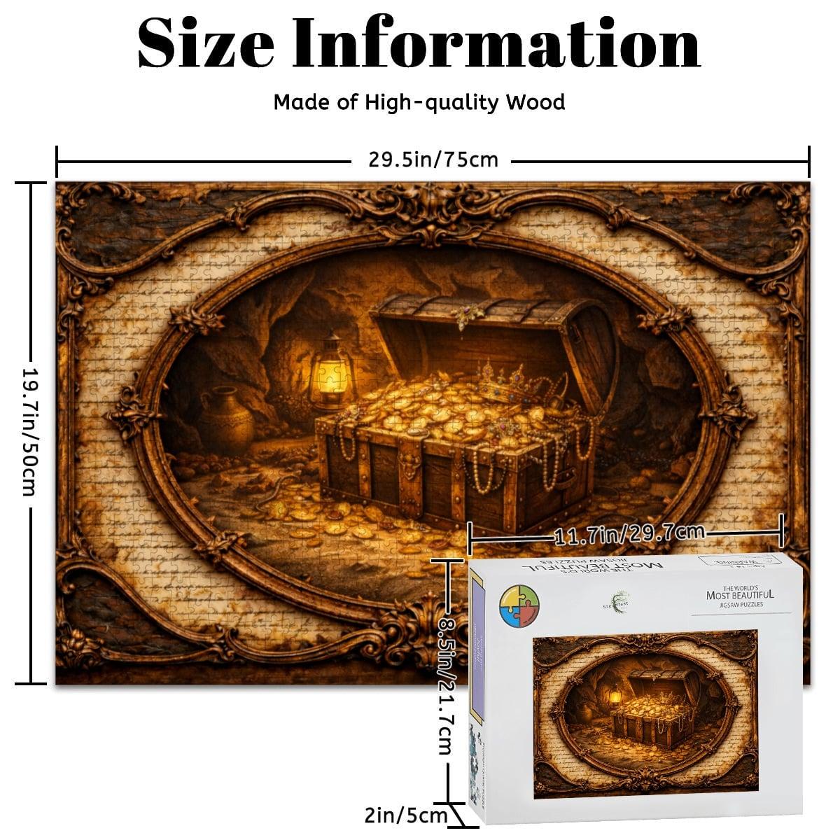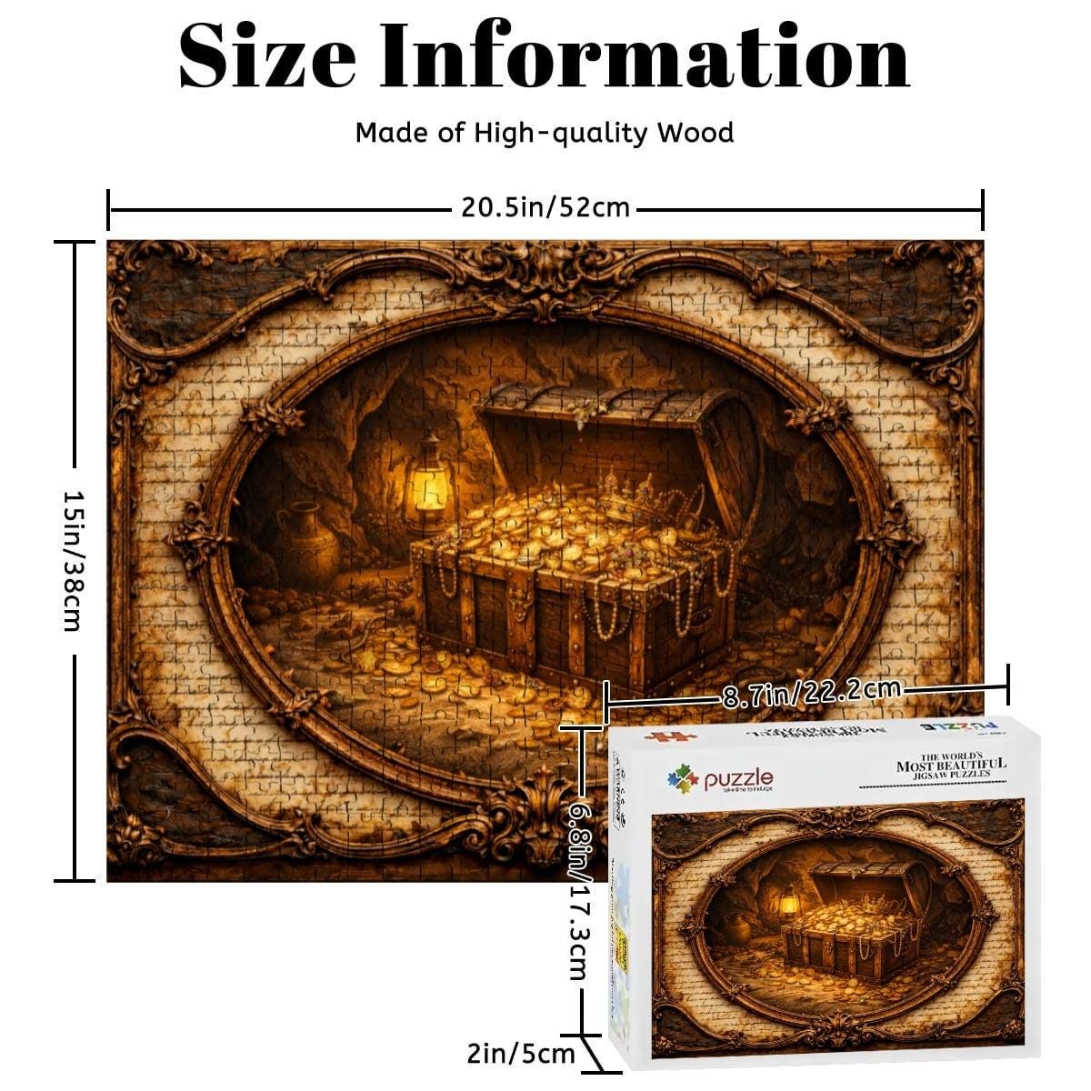 Discover the excitement of hidden riches with this stunning Treasure Chest Wooden Puzzle. The artwork features an overflowing treasure chest filled with glowing gold coins and precious treasures, illuminated by warm lantern light inside a cave.