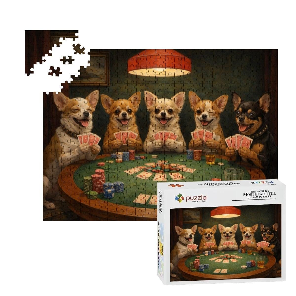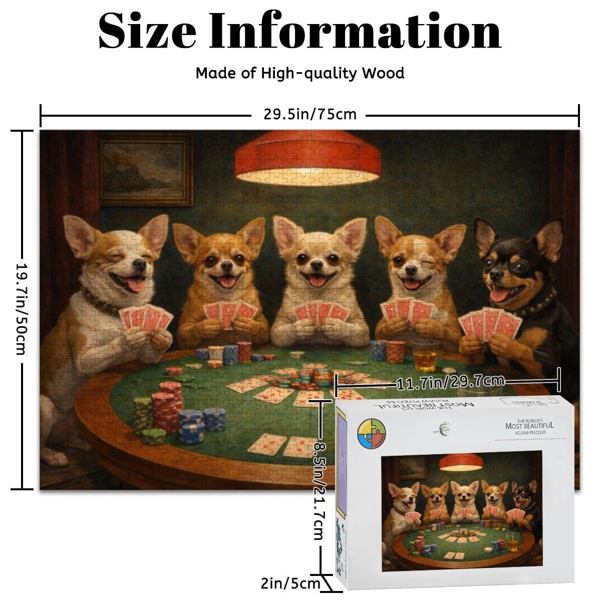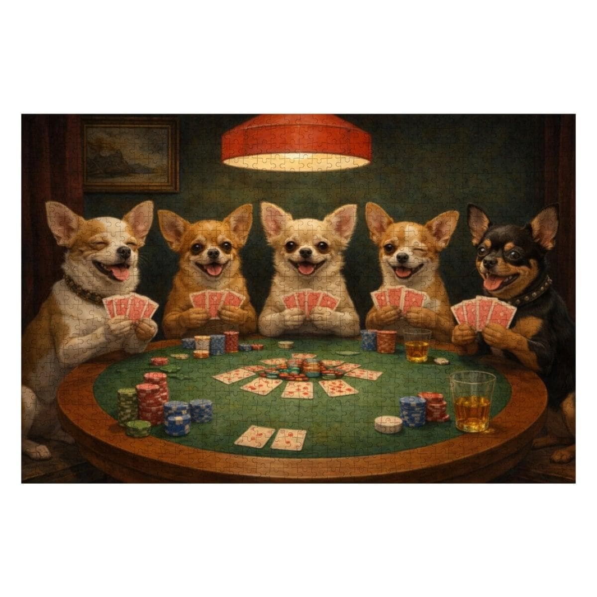 Get ready for a hilarious game night with this Chihuahua Poker Puzzle featuring a group of adorable dogs gathered around a poker table.