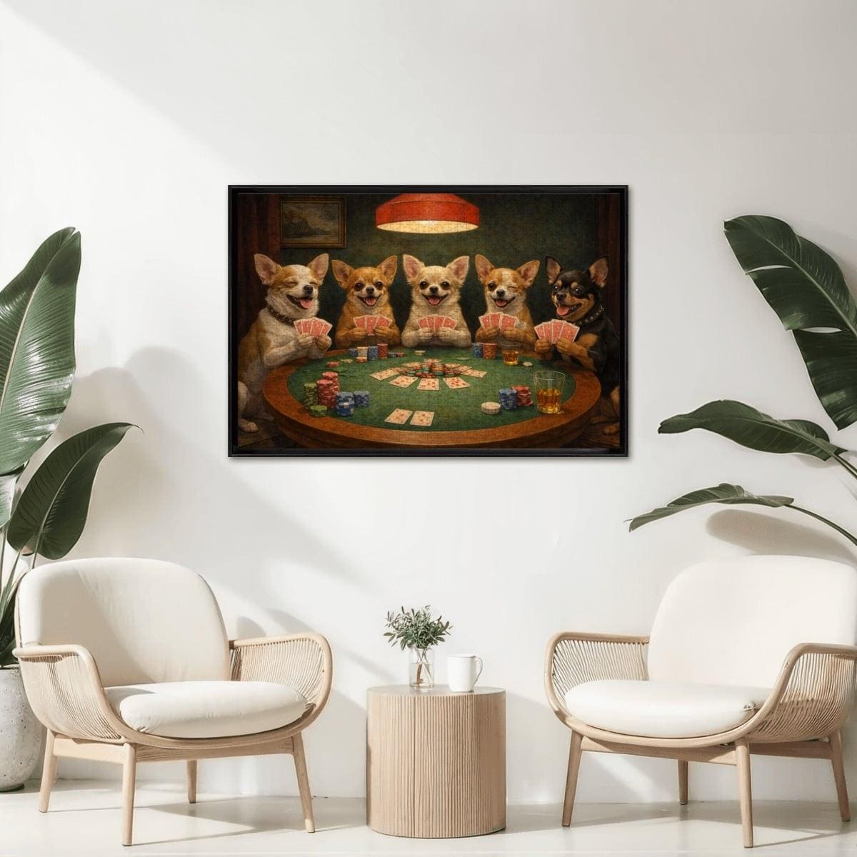 In this playful scene, several chihuahuas sit together under warm lighting while holding cards and playing a game of poker. With stacks of chips on the table and each pup showing its own personality, this fun artwork captures the classic “dogs playing poker” theme with a cozy twist.