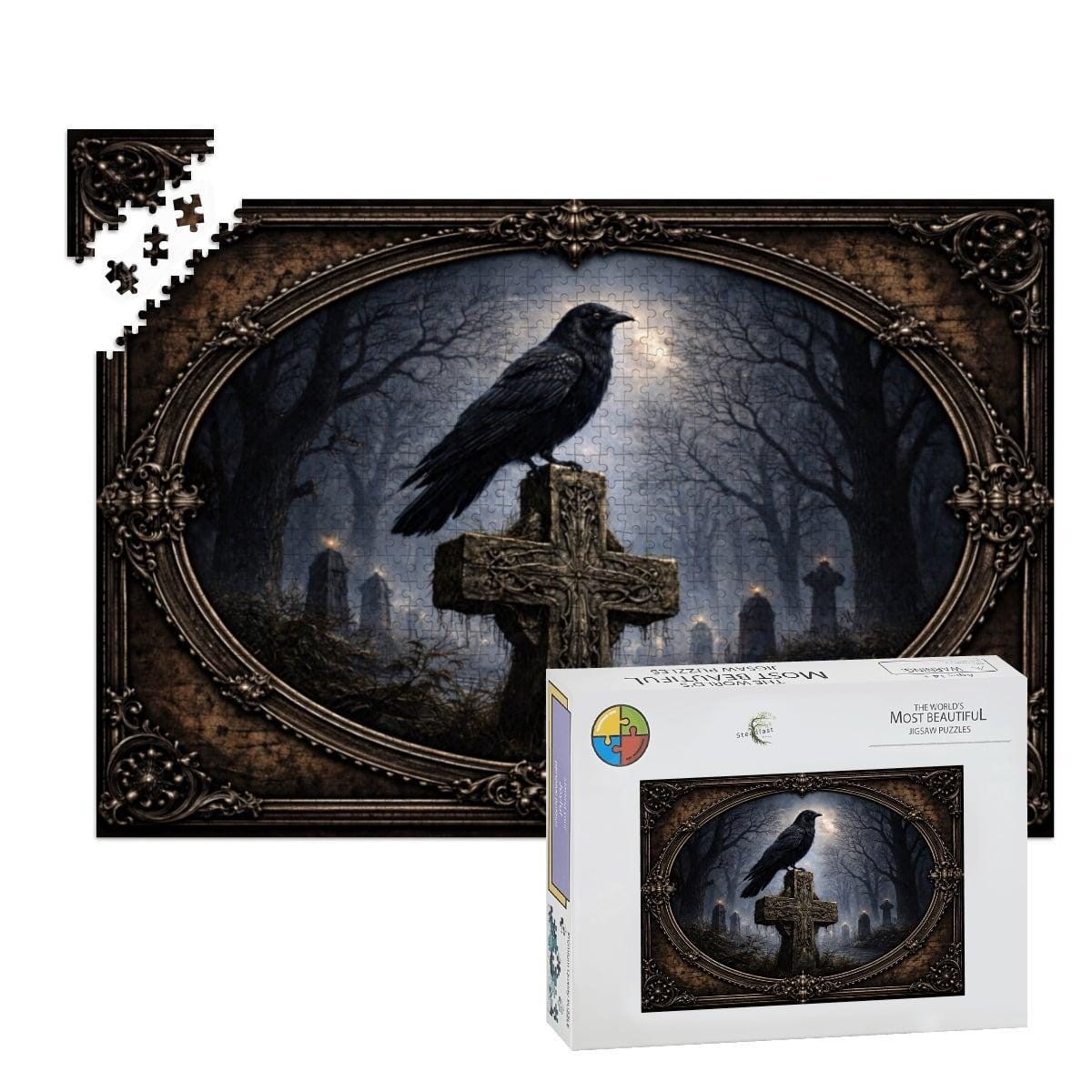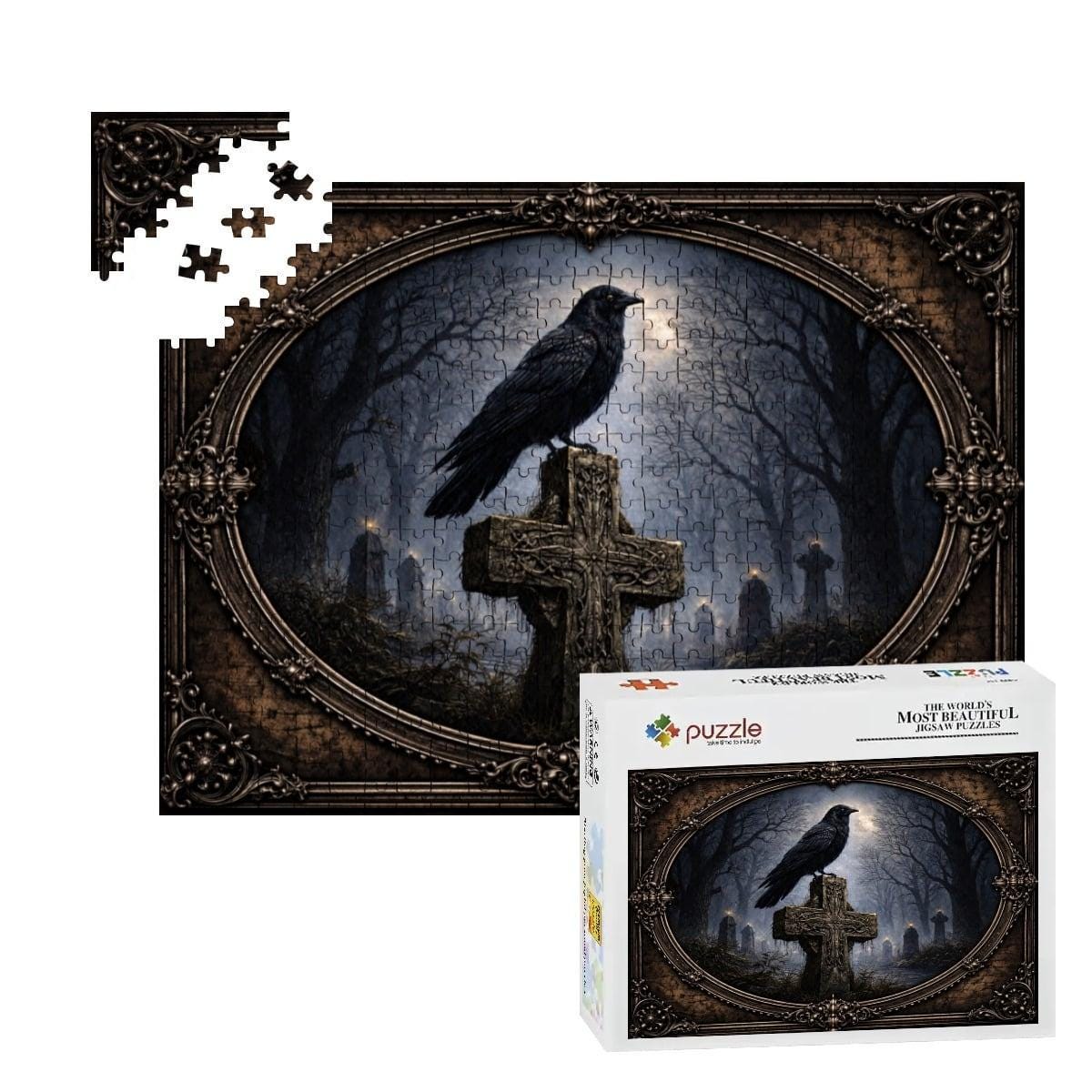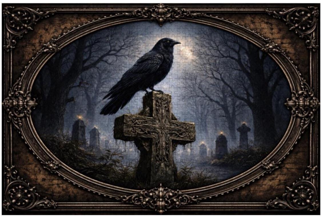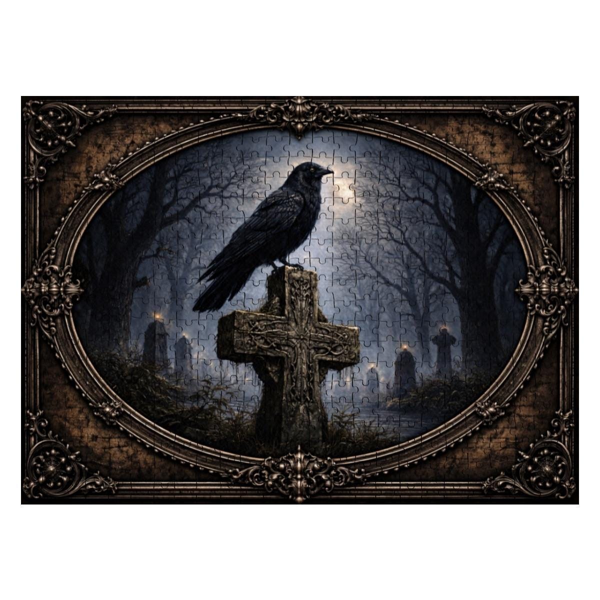 Step into a dark and mysterious scene with this gothic raven puzzle, featuring a haunting cemetery, glowing moonlight, and a striking crow perched on a weathered cross.
