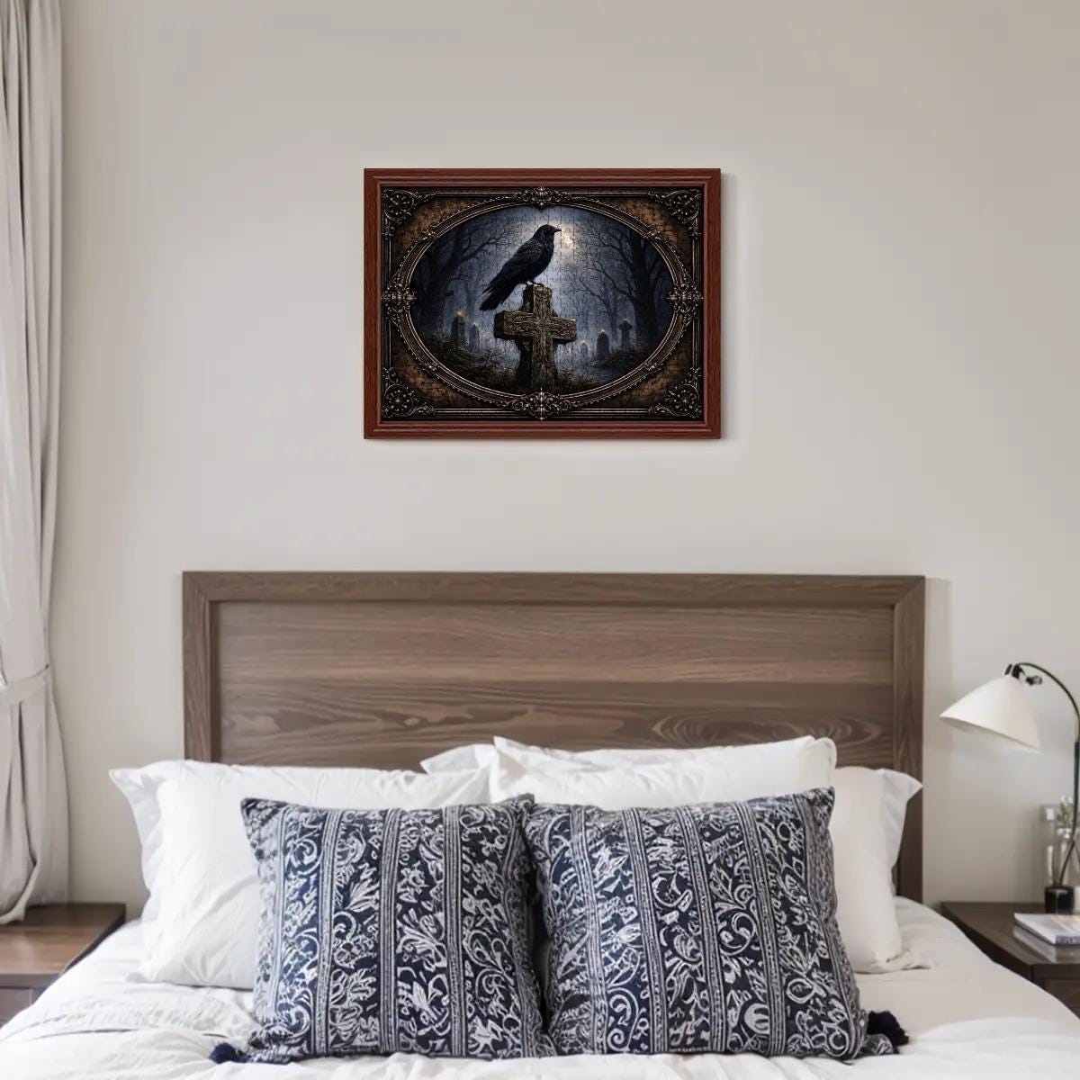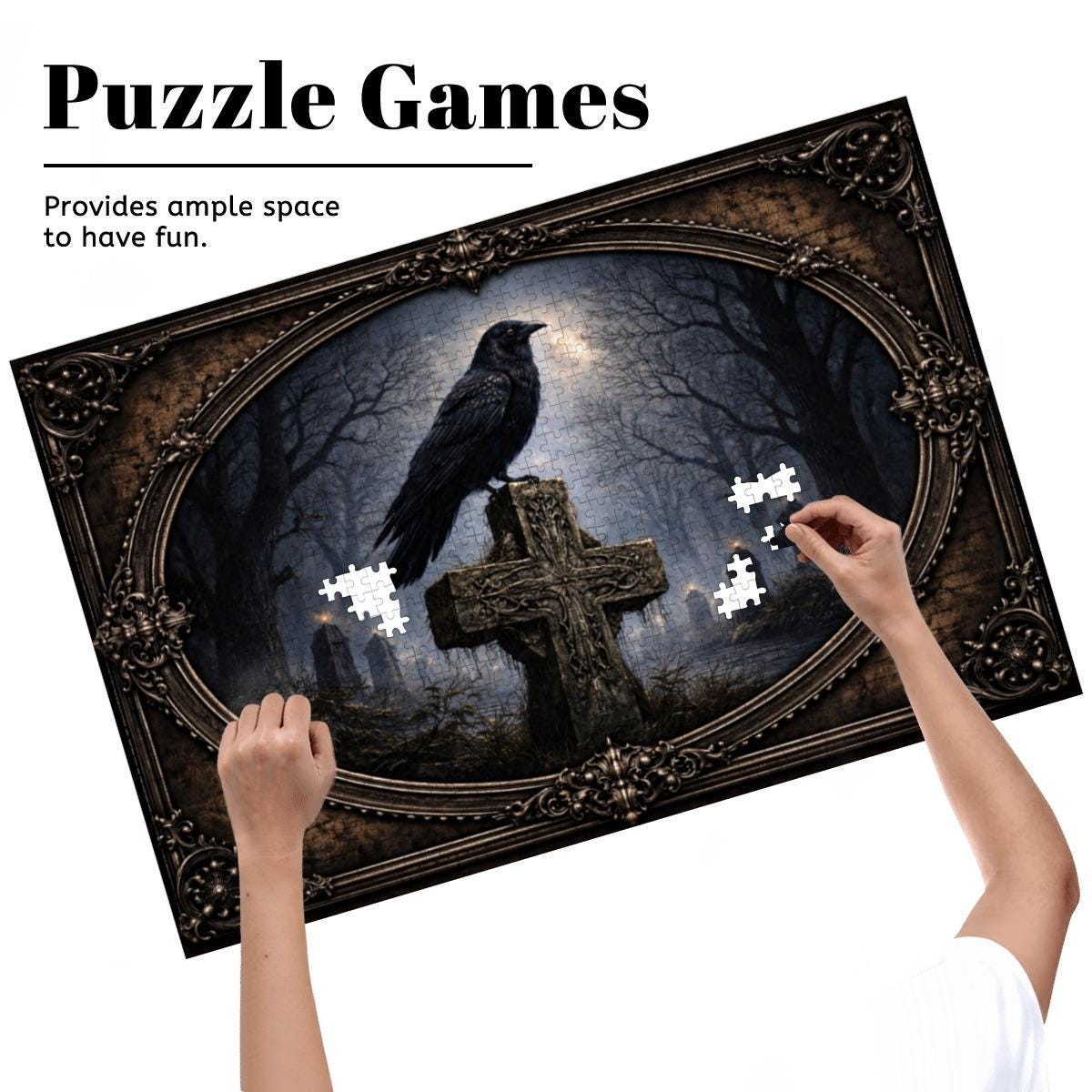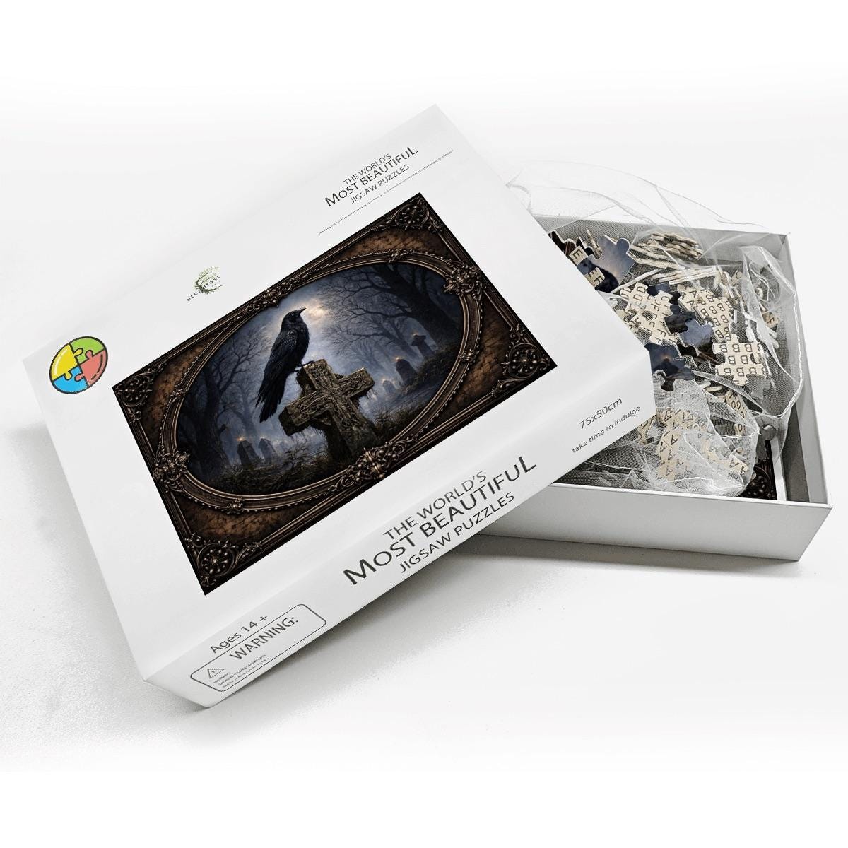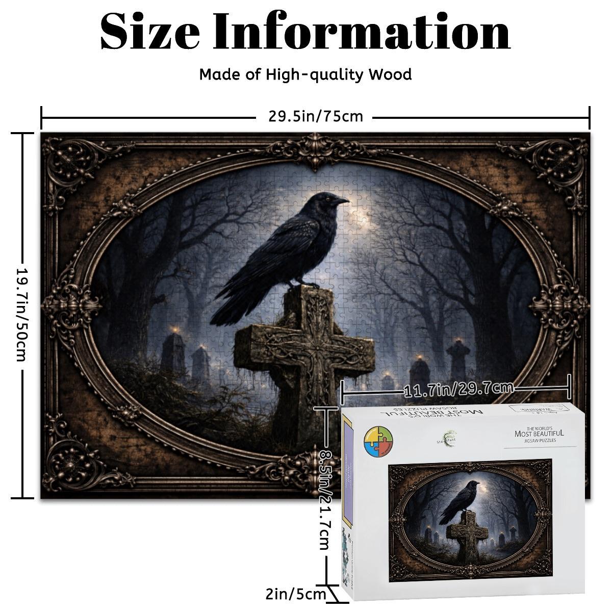 Step into a dark and mysterious scene with this gothic raven puzzle, featuring a haunting cemetery, glowing moonlight, and a striking crow perched on a weathered cross.