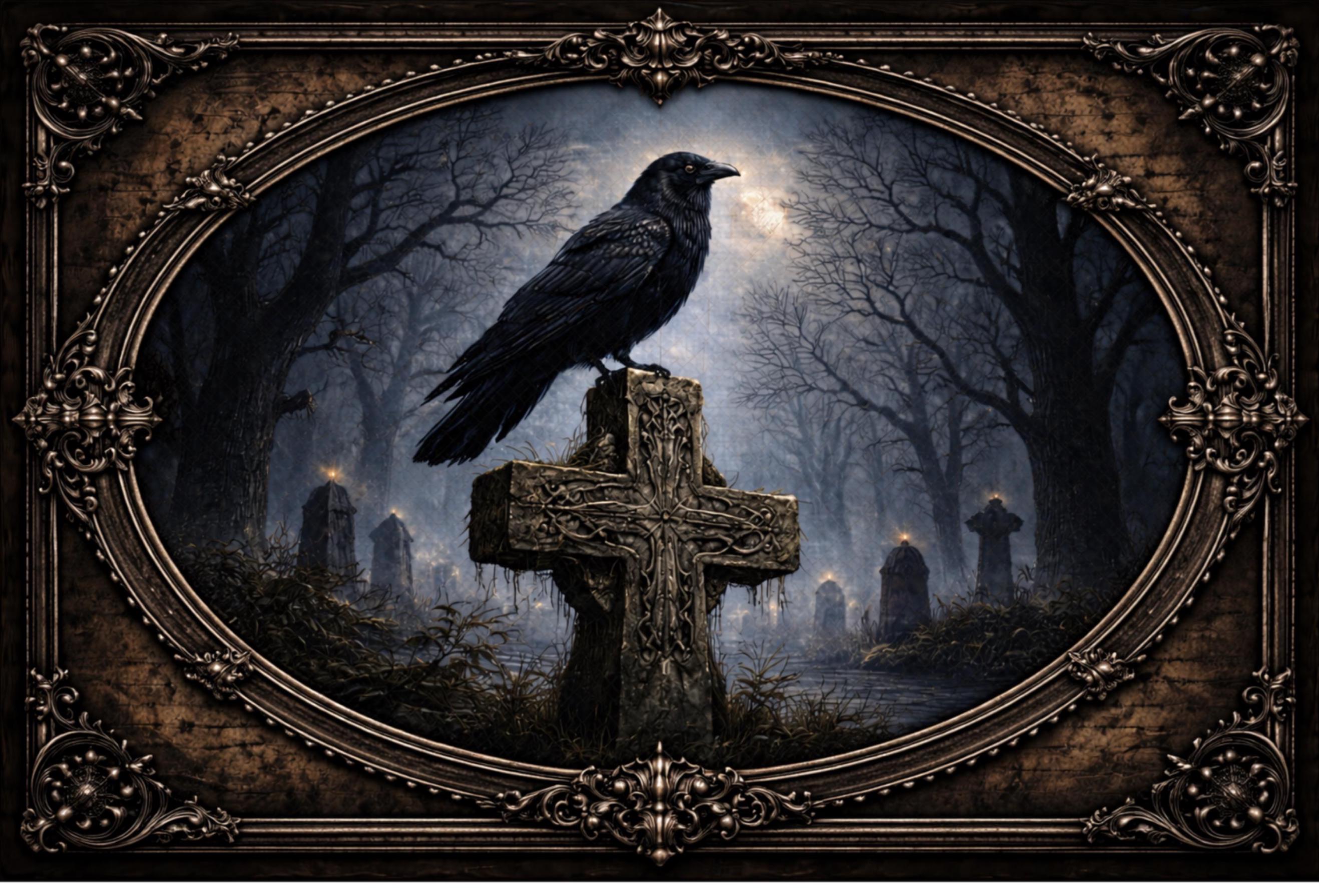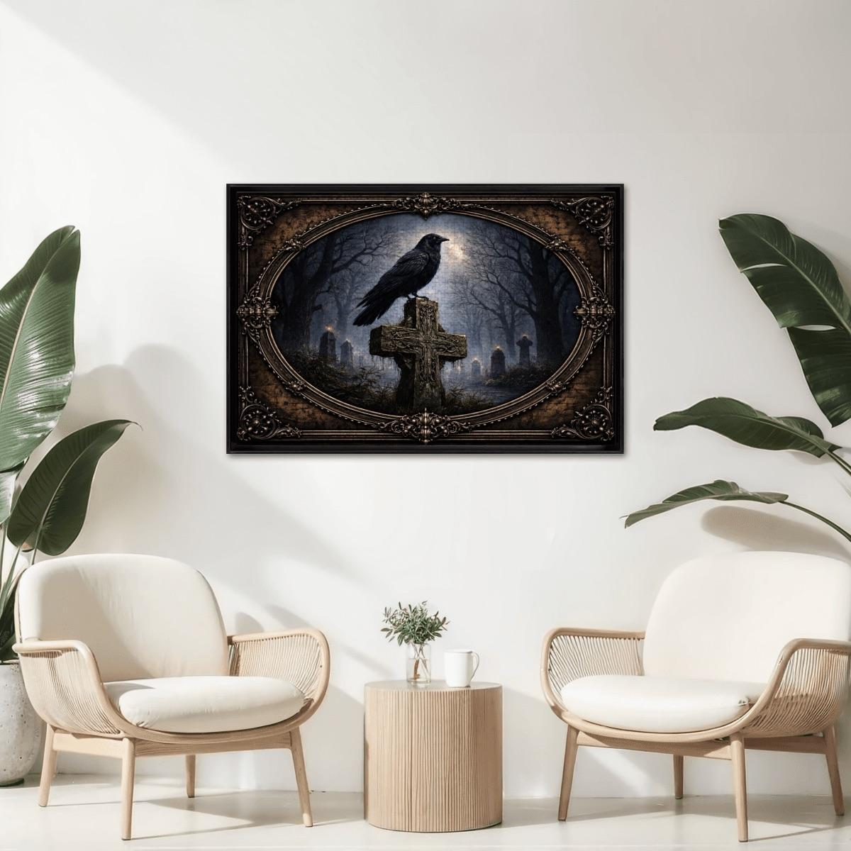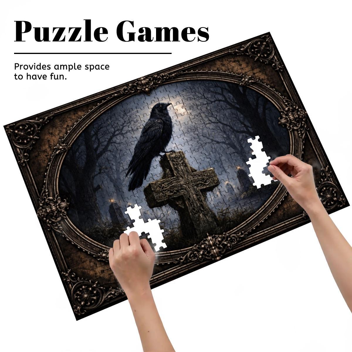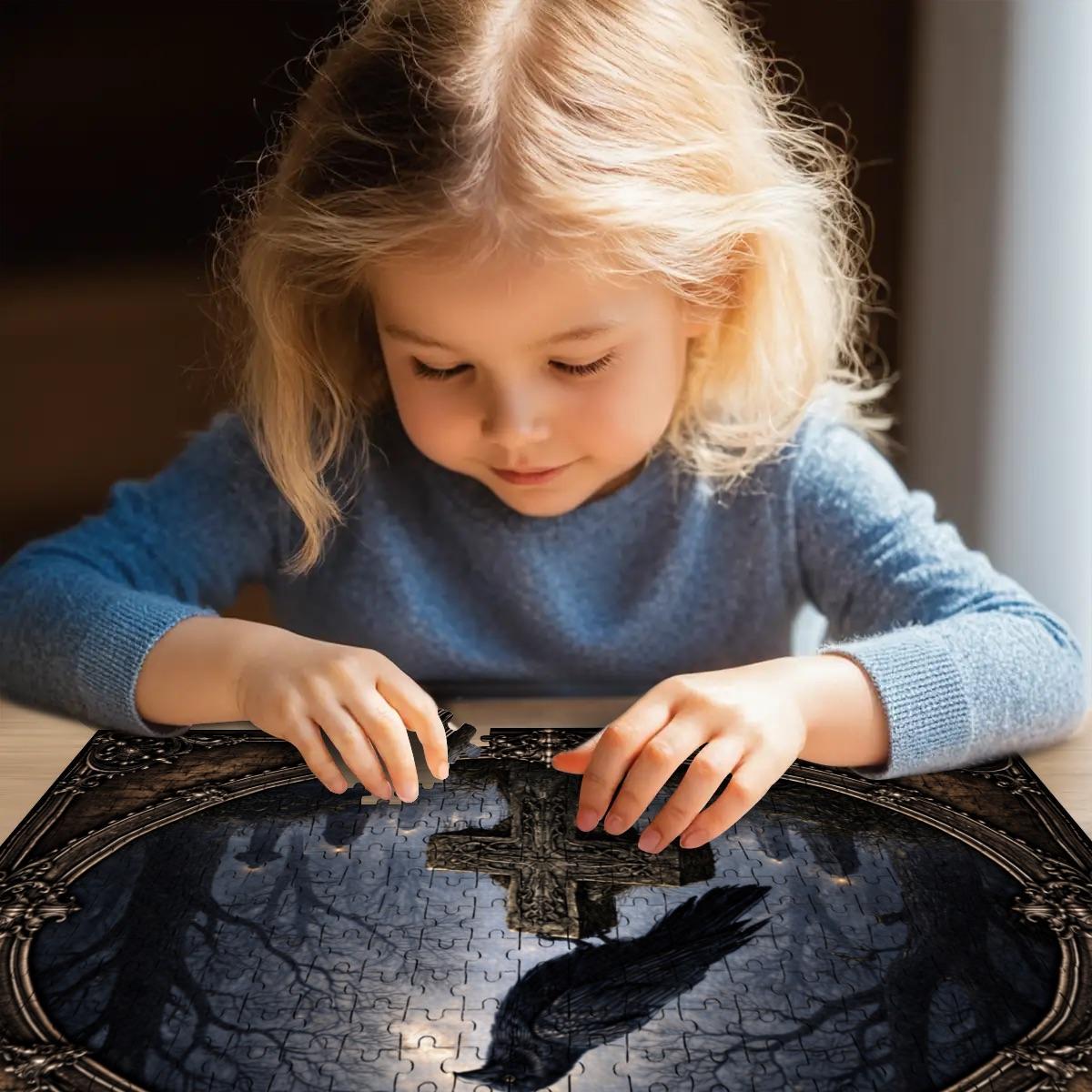 Step into a dark and mysterious scene with this gothic raven puzzle, featuring a haunting cemetery, glowing moonlight, and a striking crow perched on a weathered cross.