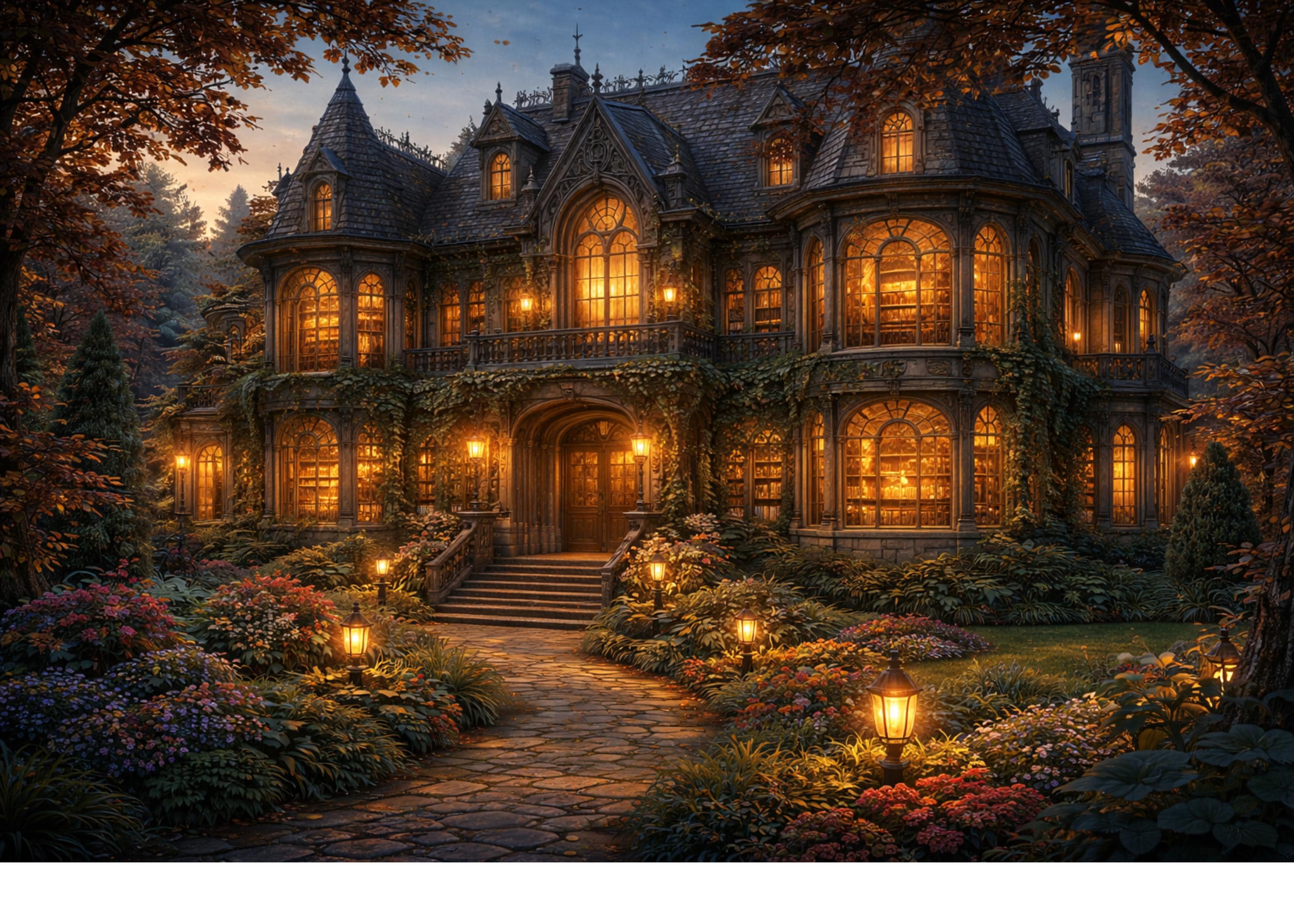 Step into a beautifully lit cozy cottage mansion at dusk, surrounded by glowing lanterns, lush gardens, and warm golden windows.