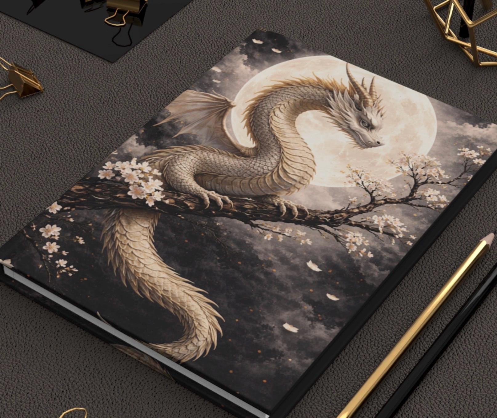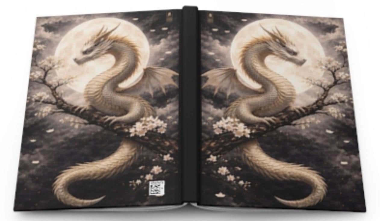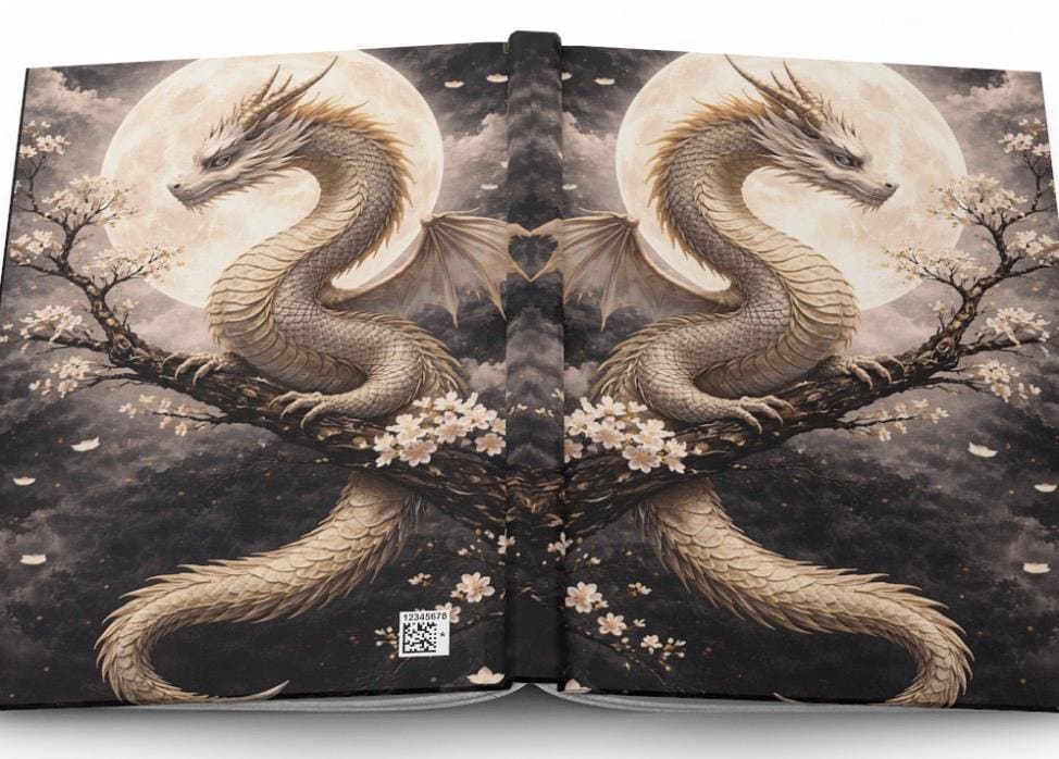 Under a wide, luminous moon a pale dragon coils around a blossoming branch — quiet, watchful, and impossibly graceful. This hardcover journal brings that hush of midnight and the slow, steady heartbeat of myth into your daily notes. The matte laminated cover keeps the artwork soft to the touch while protecting it from wear, and the full wraparound print makes the scene feel immersive from every angle. Inside, 150 lined pages with perforations give you space to plan, sketch, and tear out what you need without damaging the spine. The sewn casewrap binding lets the book open flat and stay flexible as you write. Keep it on your nightstand for private thoughts, carry it to sketch sessions, or use it during late-night planning sessions when ideas feel like moonlight — calm, clear, and a little wild.