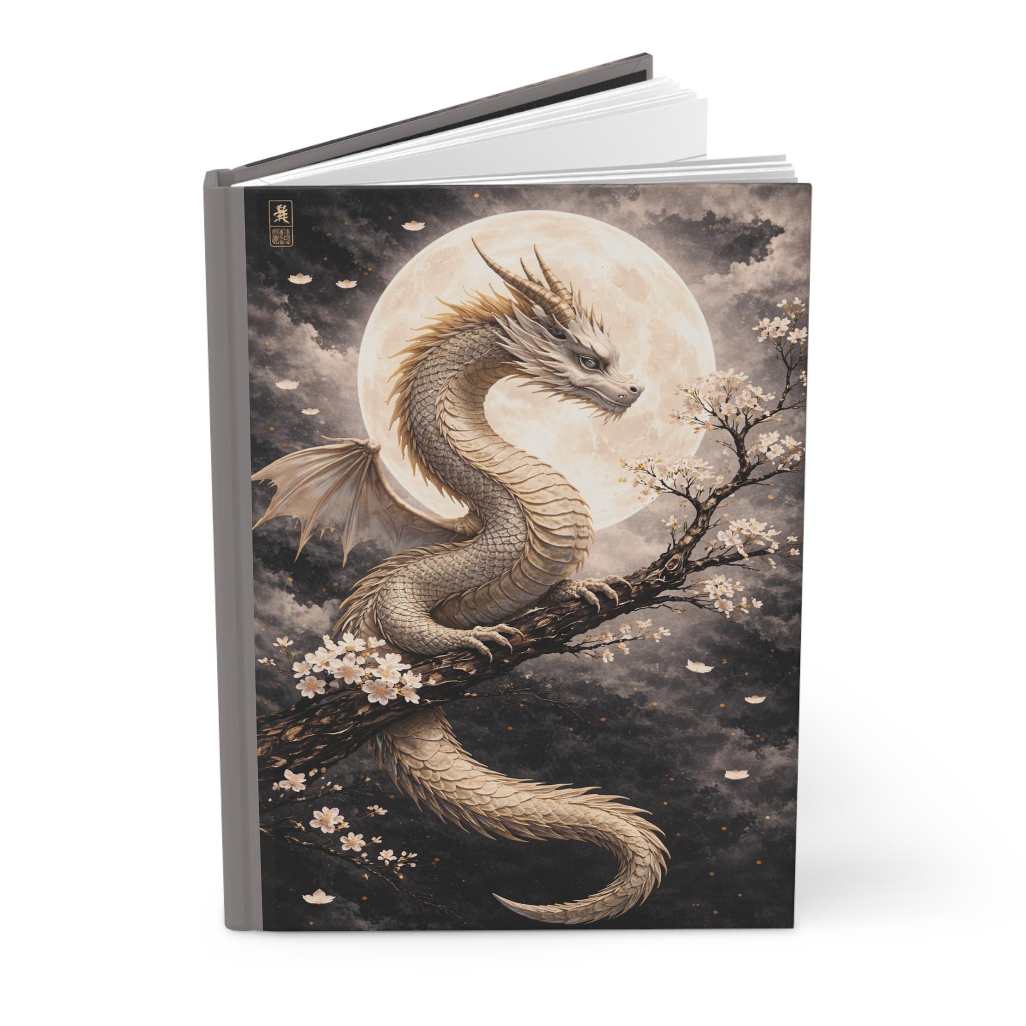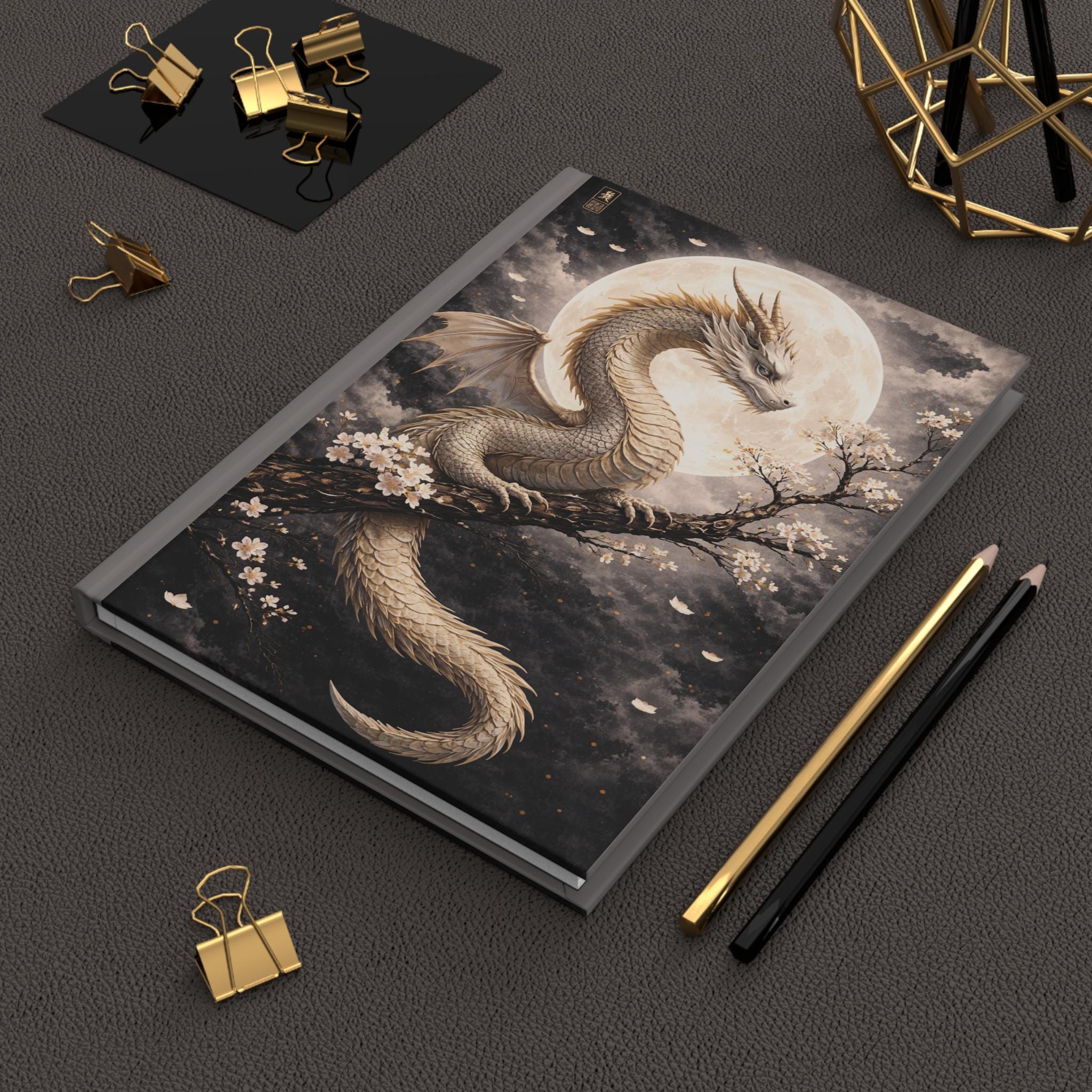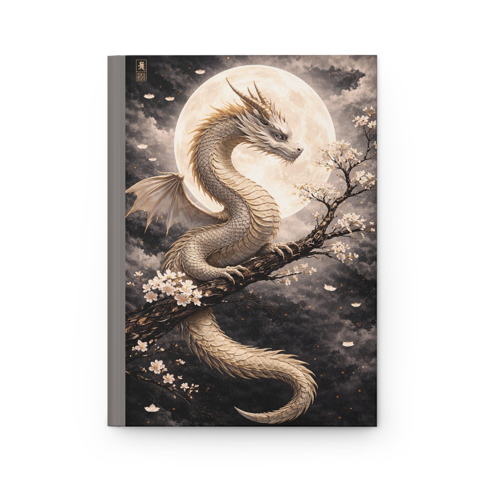 Under a wide, luminous moon a pale dragon coils around a blossoming branch — quiet, watchful, and impossibly graceful. This hardcover journal brings that hush of midnight and the slow, steady heartbeat of myth into your daily notes. The matte laminated cover keeps the artwork soft to the touch while protecting it from wear, and the full wraparound print makes the scene feel immersive from every angle. Inside, 150 lined pages with perforations give you space to plan, sketch, and tear out what you need without damaging the spine. The sewn casewrap binding lets the book open flat and stay flexible as you write. Keep it on your nightstand for private thoughts, carry it to sketch sessions, or use it during late-night planning sessions when ideas feel like moonlight — calm, clear, and a little wild.