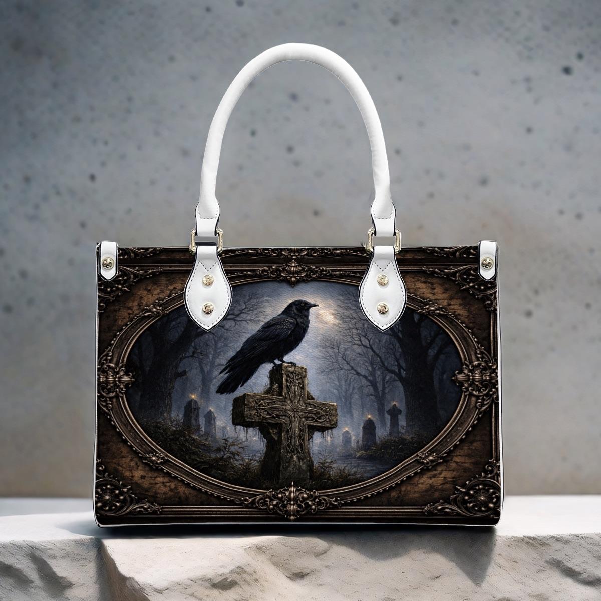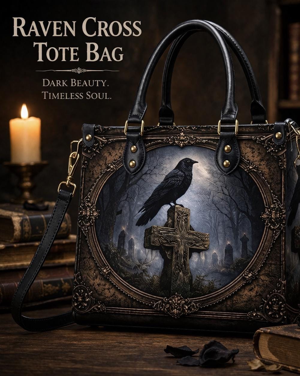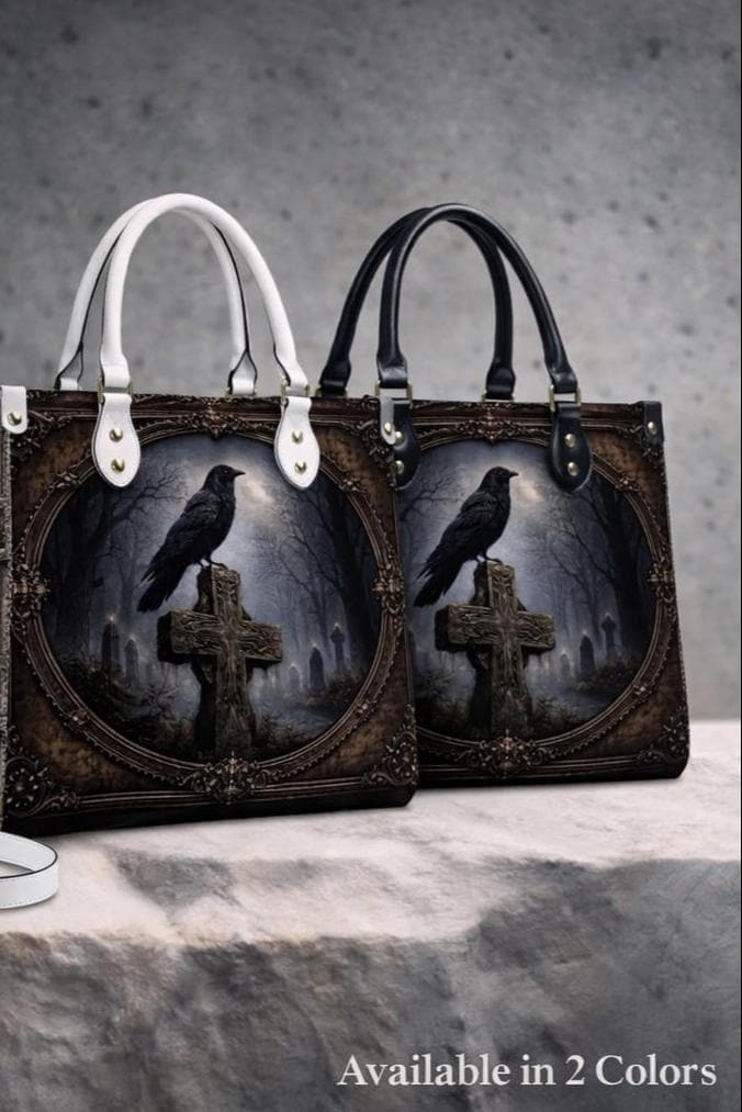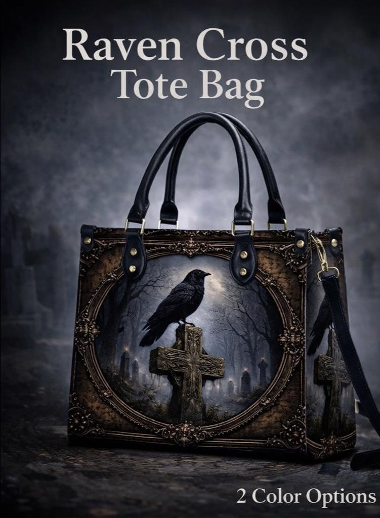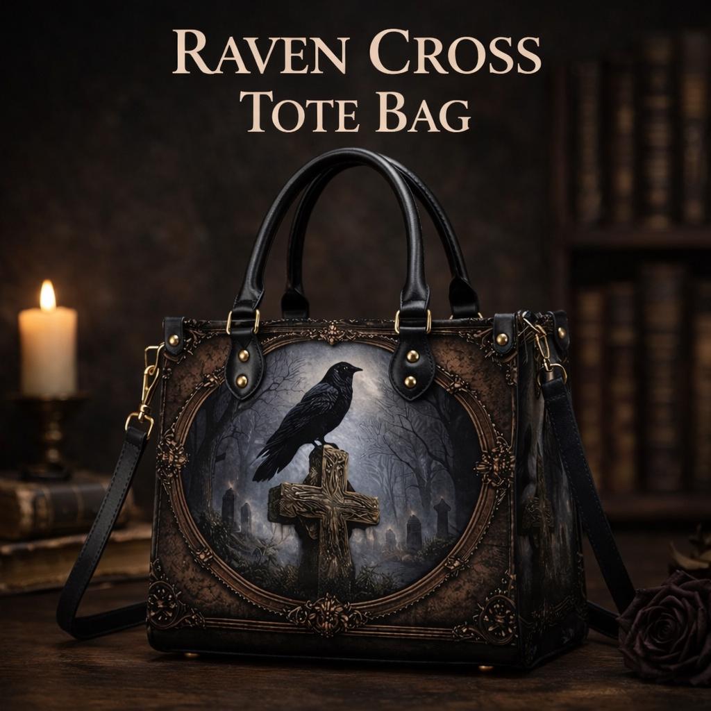 Dark, meaningful, and beautifully detailed, this Raven Cross Tote Bag features a striking raven perched on a weathered cross surrounded by a misty, gothic landscape. With deep tones and vintage-inspired framing, this design blends faith and dark elegance into a powerful statement piece.