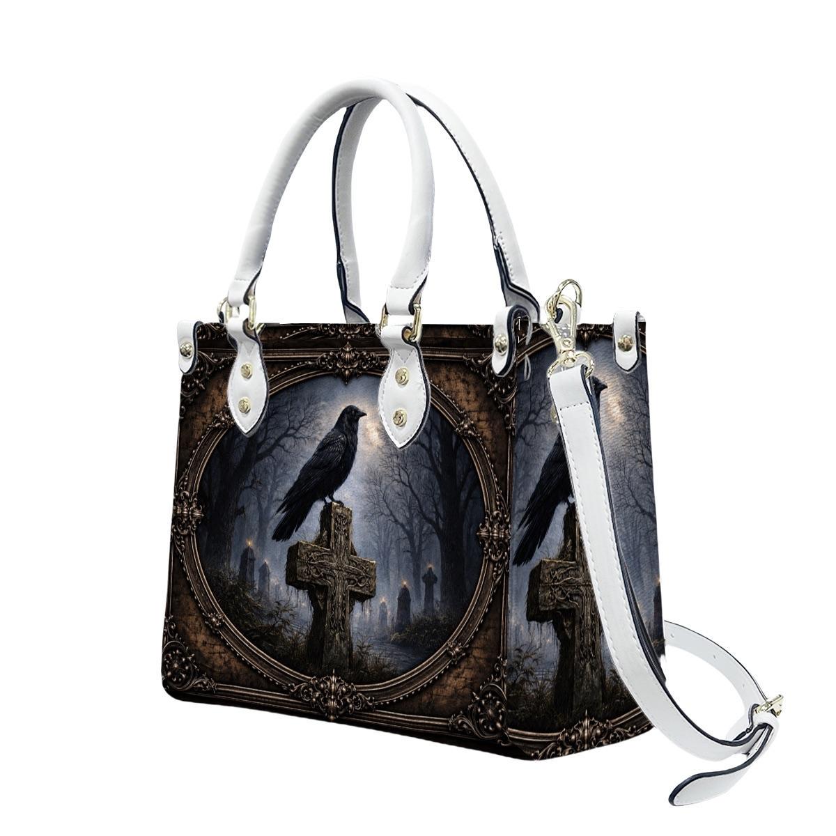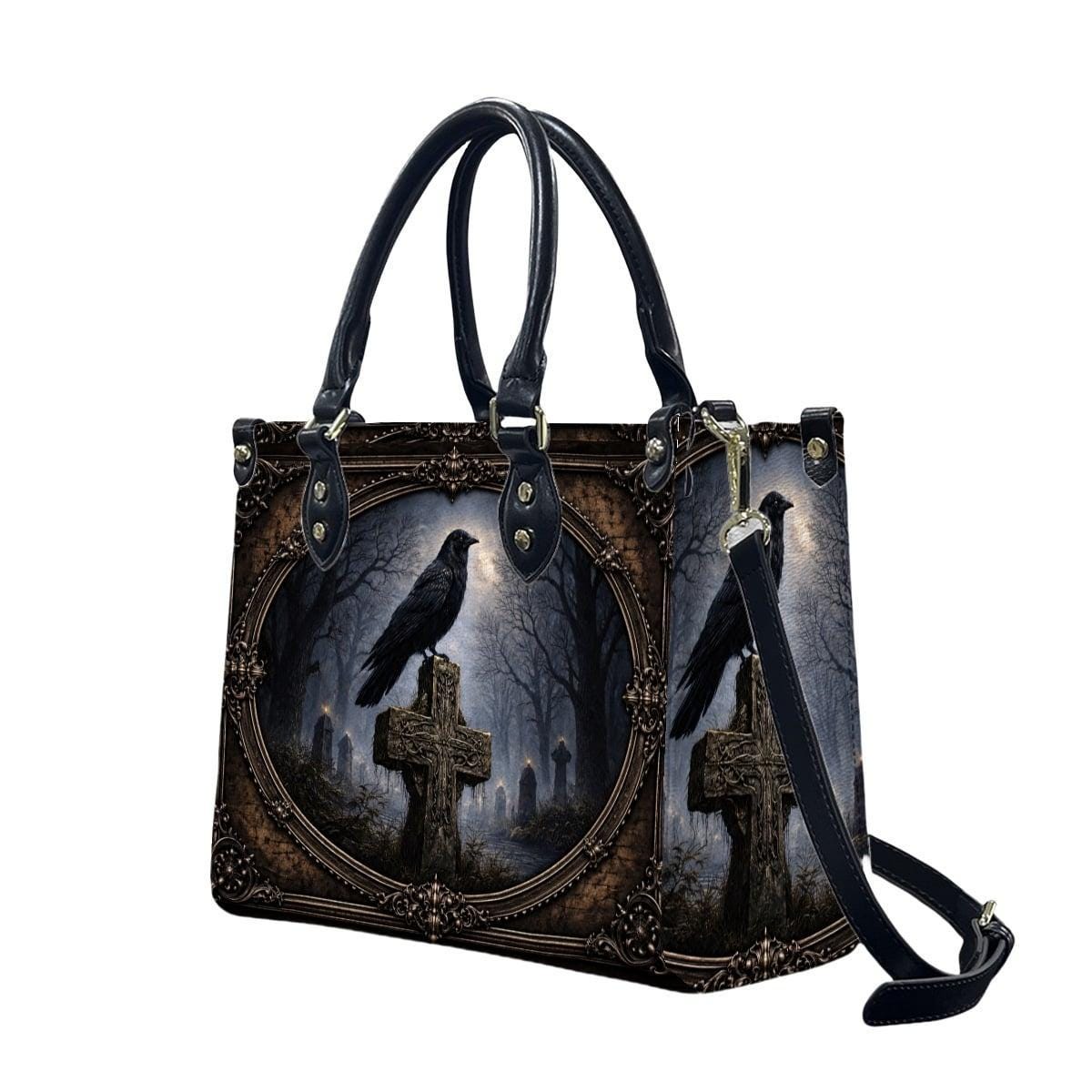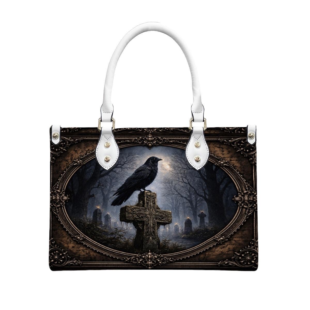 Dark, meaningful, and beautifully detailed, this Raven Cross Tote Bag features a striking raven perched on a weathered cross surrounded by a misty, gothic landscape. With deep tones and vintage-inspired framing, this design blends faith and dark elegance into a powerful statement piece.