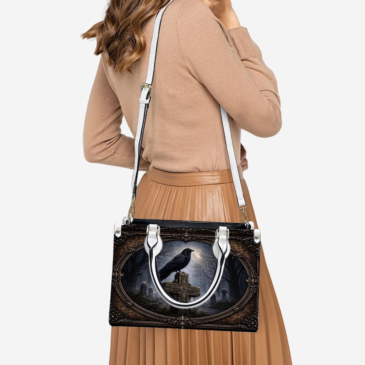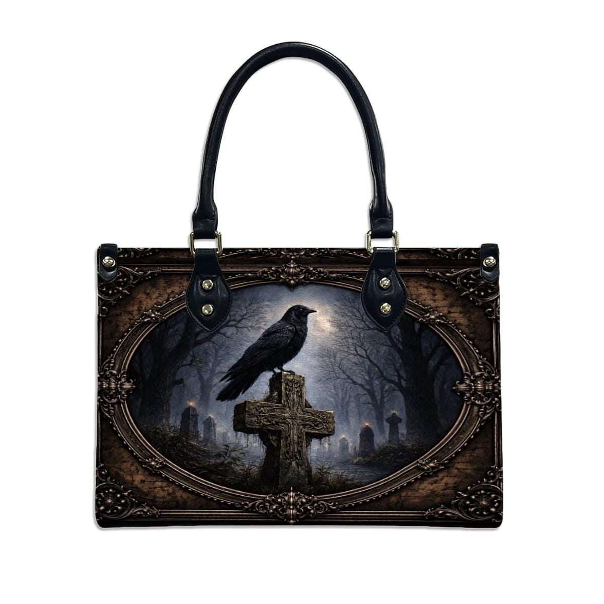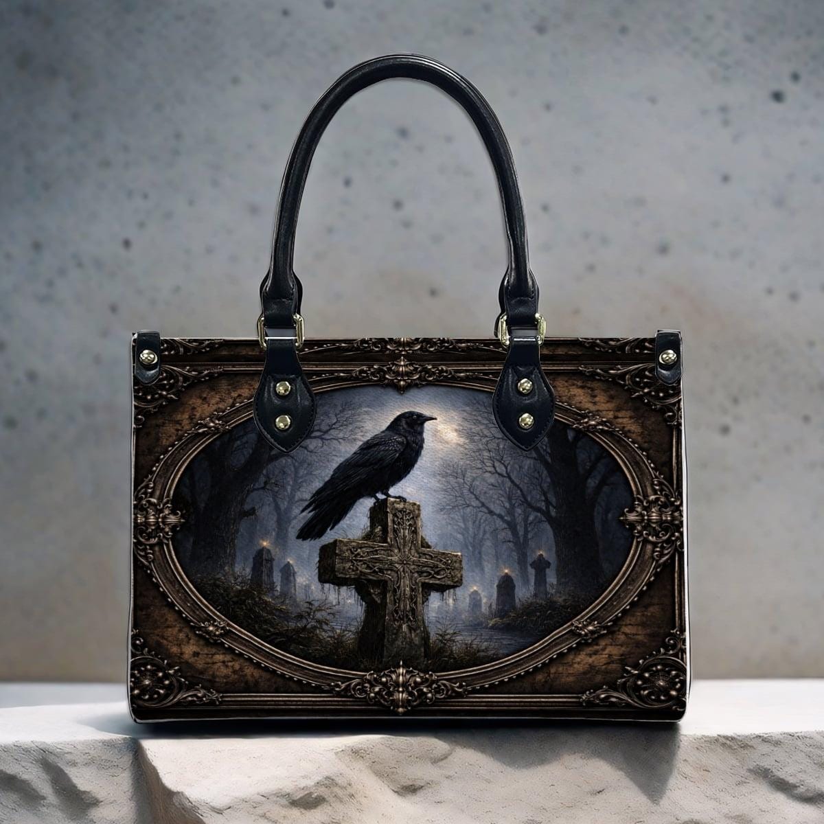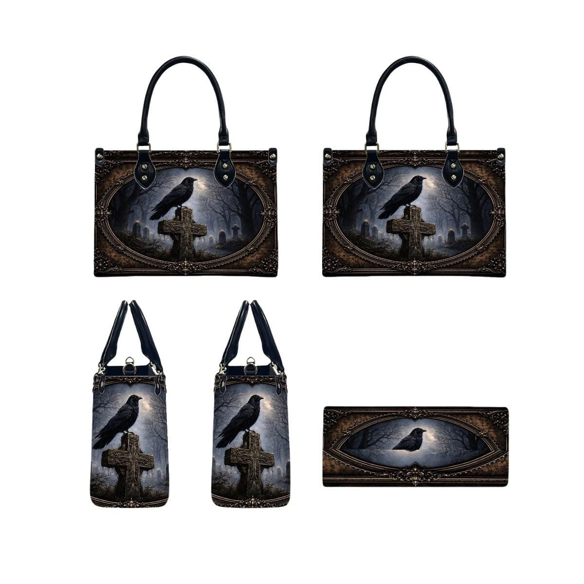 Dark, meaningful, and beautifully detailed, this Raven Cross Tote Bag features a striking raven perched on a weathered cross surrounded by a misty, gothic landscape. With deep tones and vintage-inspired framing, this design blends faith and dark elegance into a powerful statement piece.