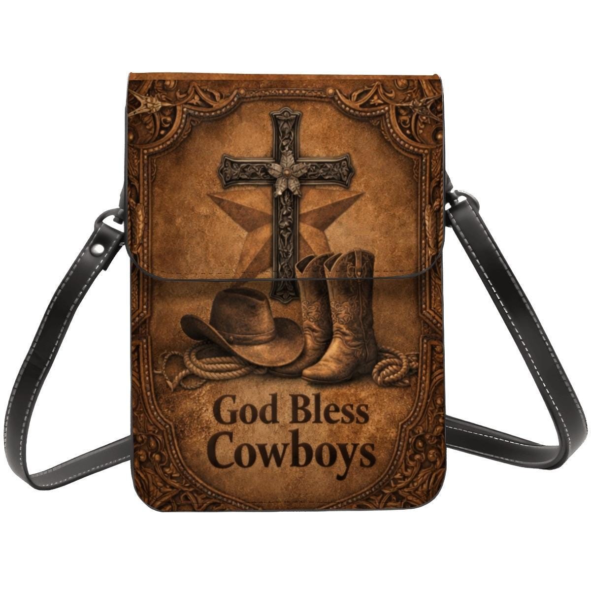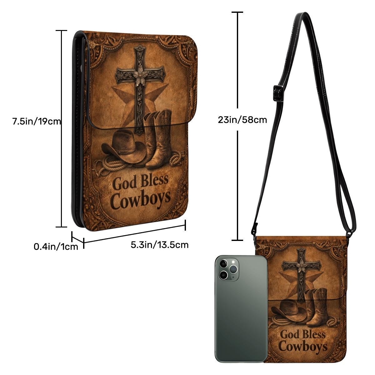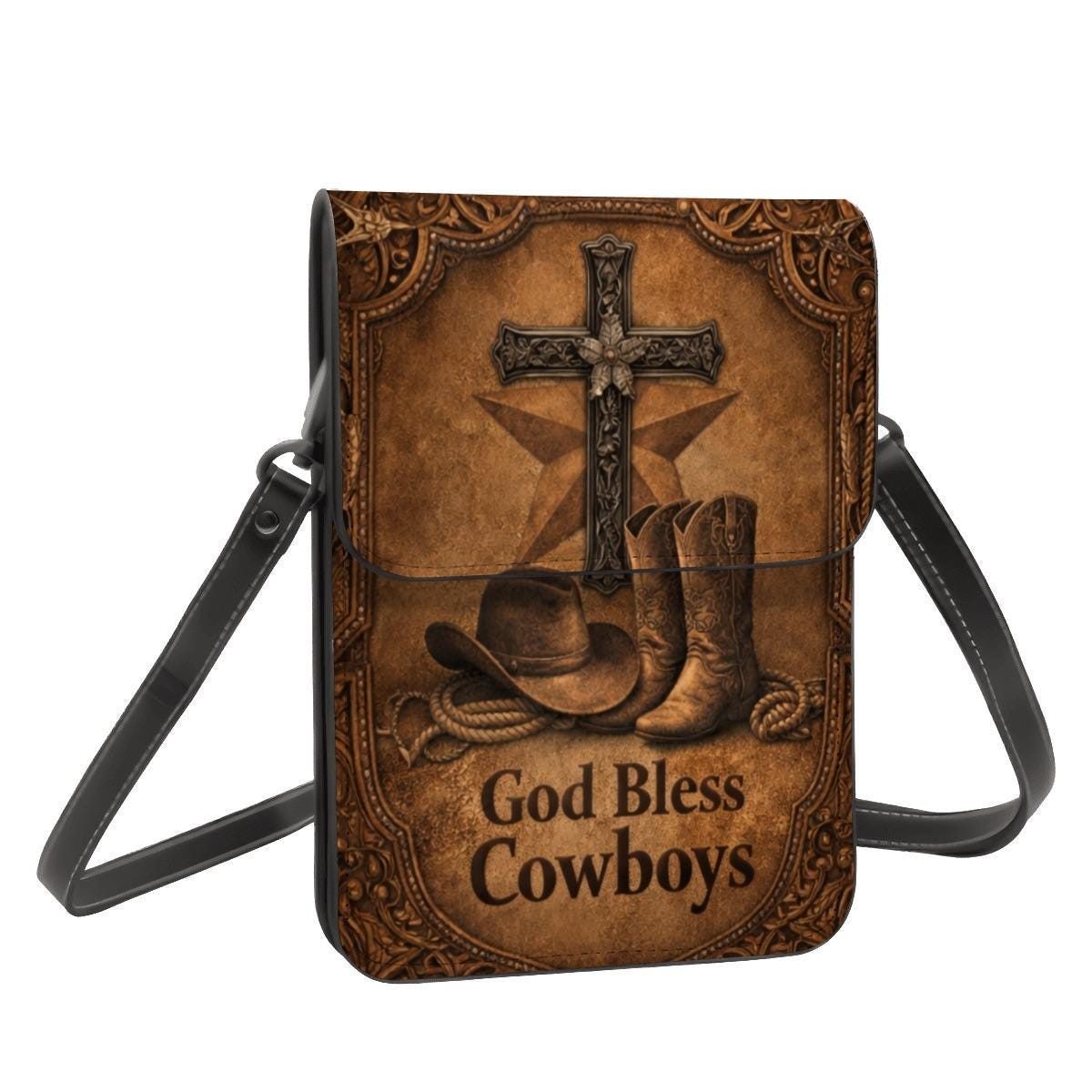 Celebrate faith and country style with this God Bless Cowboys phone purse, featuring cowboy boots, a rustic cross, and western-inspired artwork on a warm distressed leather-look background. Perfect for rodeo lovers, western fashion fans, and Christian gift giving.