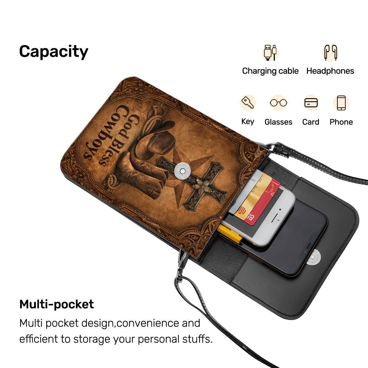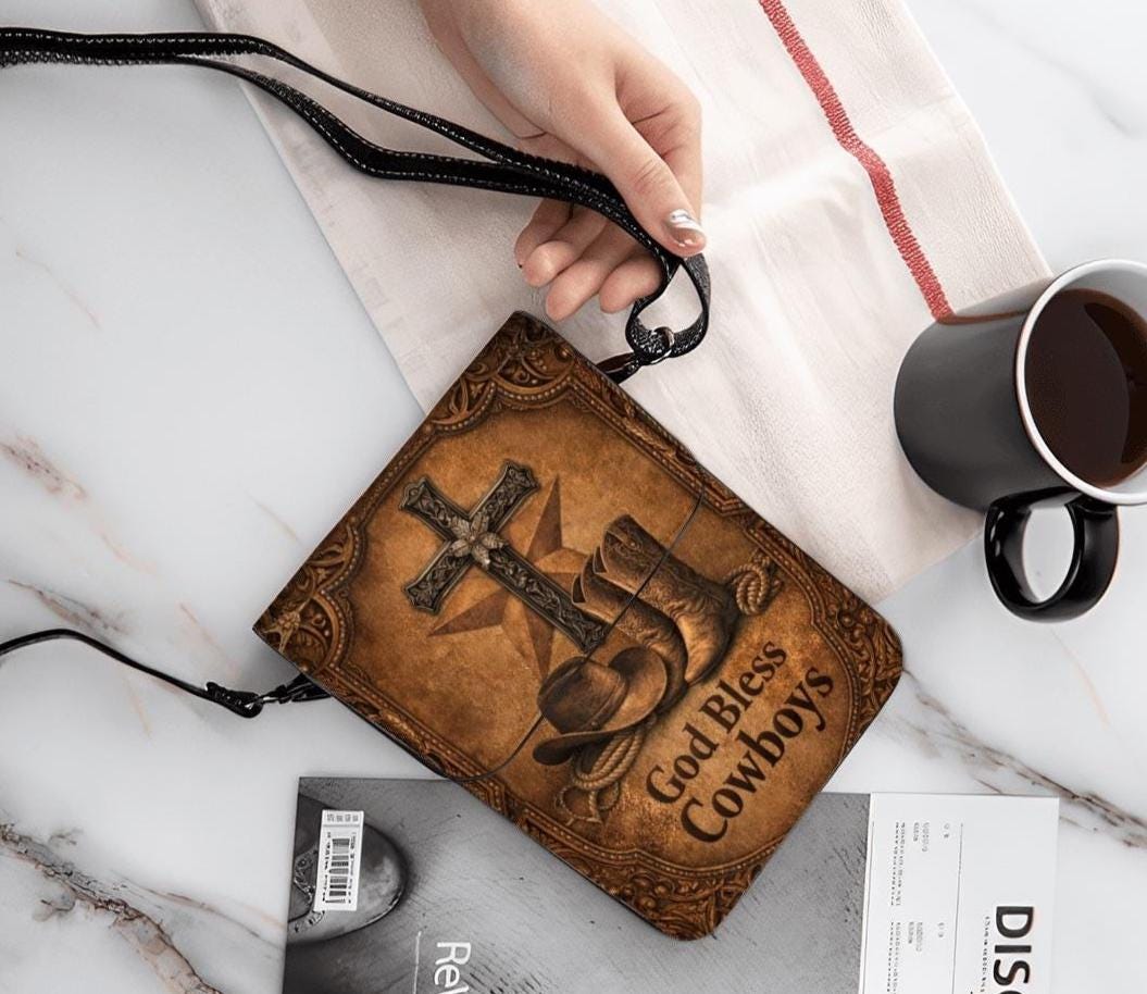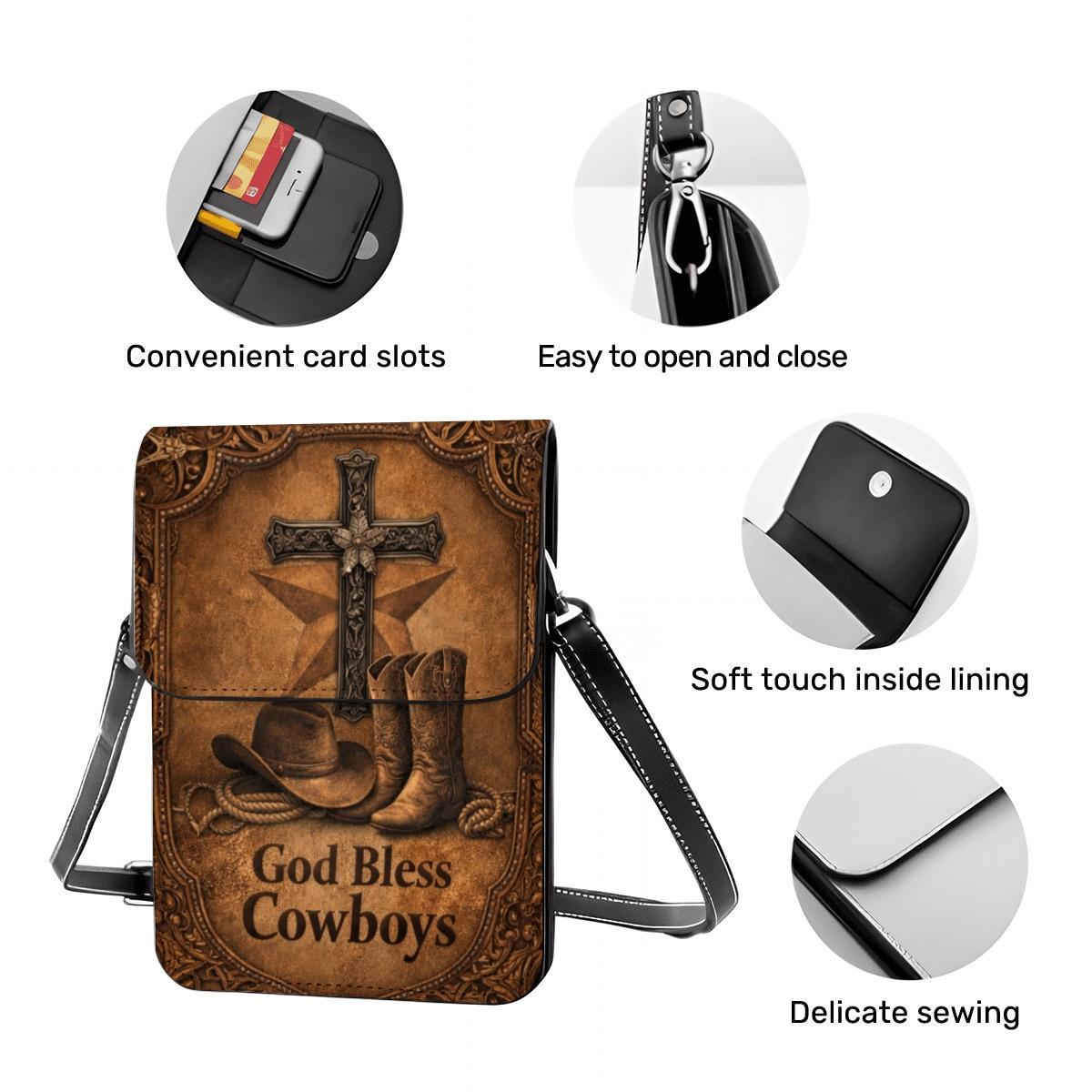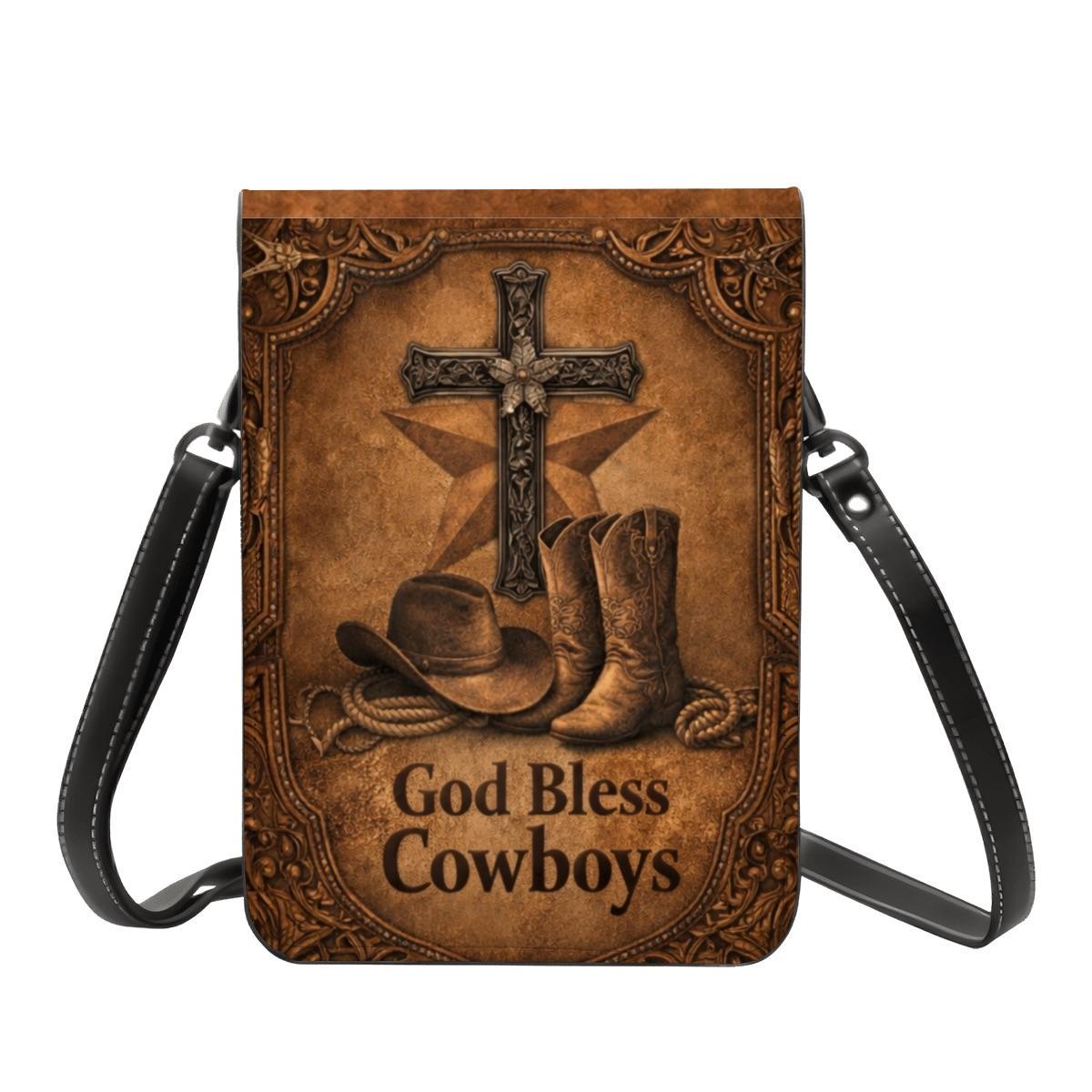 Celebrate faith and country style with this God Bless Cowboys phone purse, featuring cowboy boots, a rustic cross, and western-inspired artwork on a warm distressed leather-look background. Perfect for rodeo lovers, western fashion fans, and Christian gift giving.