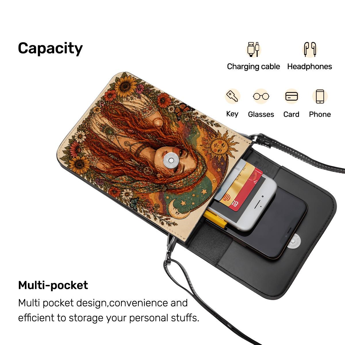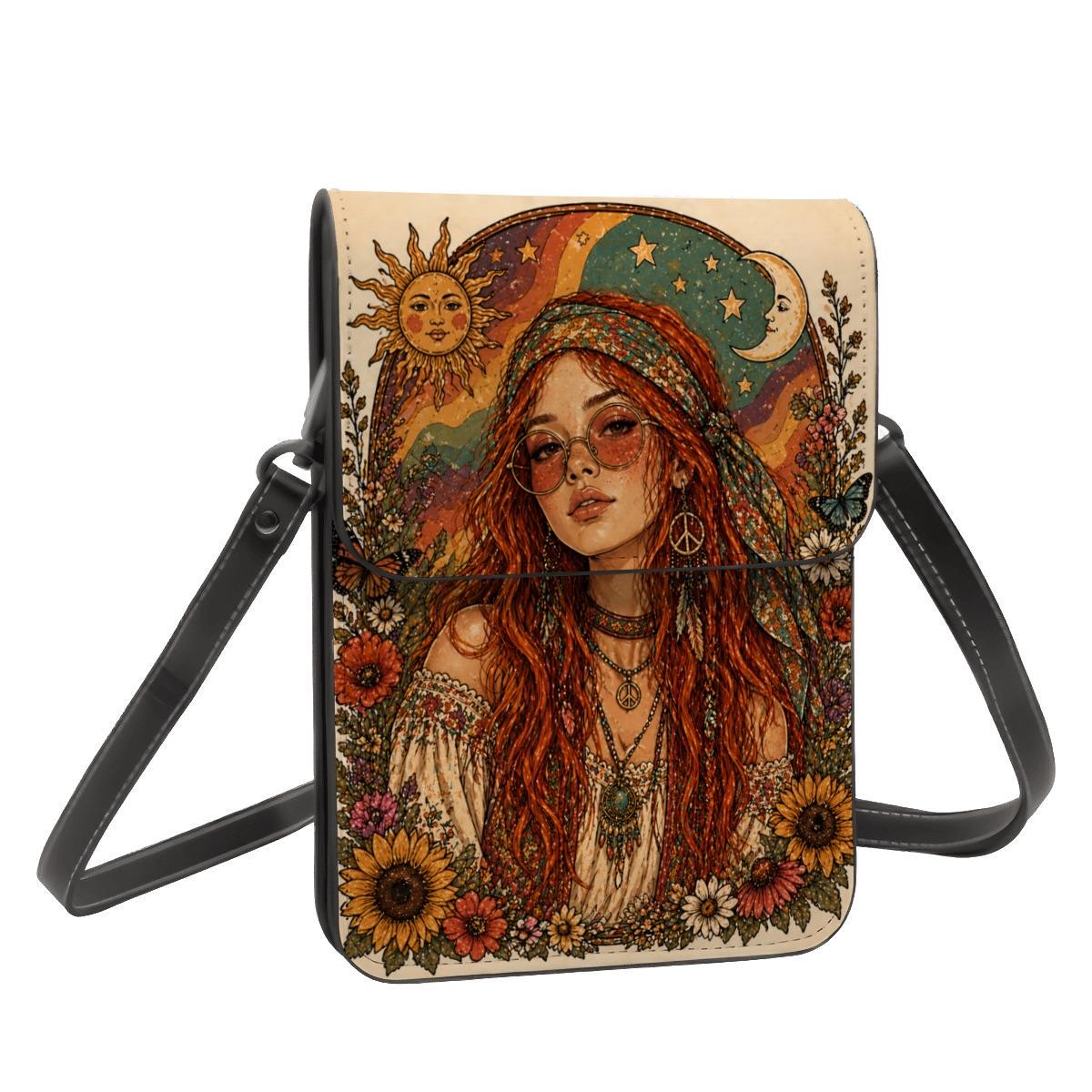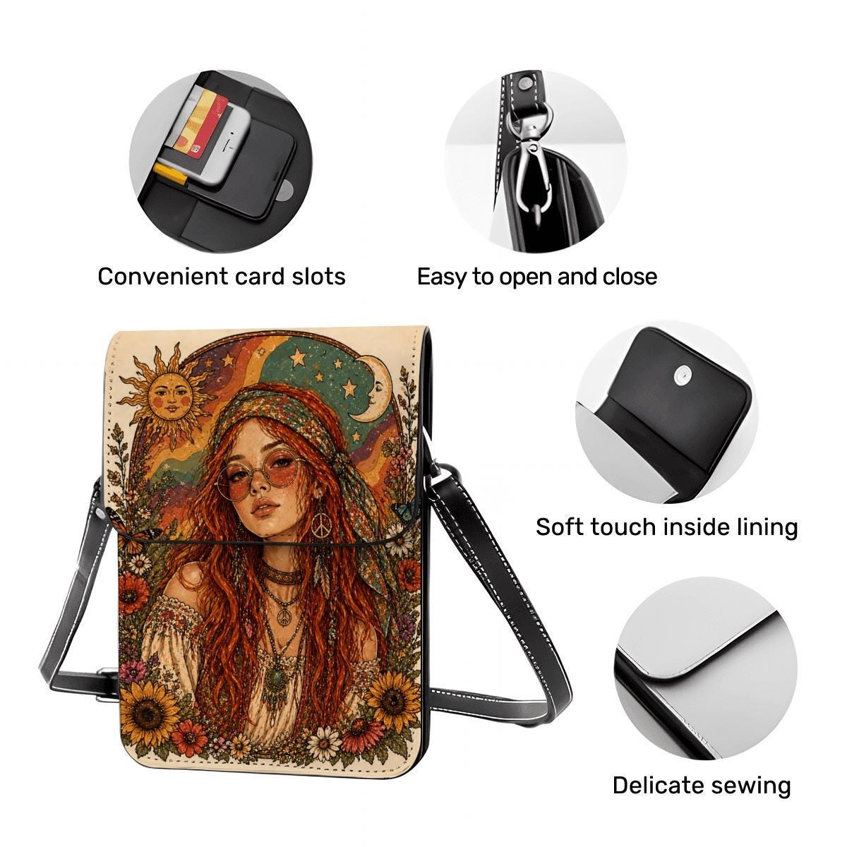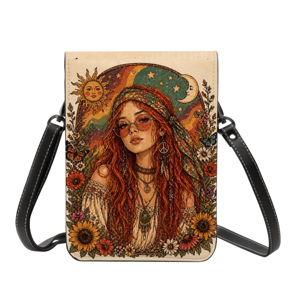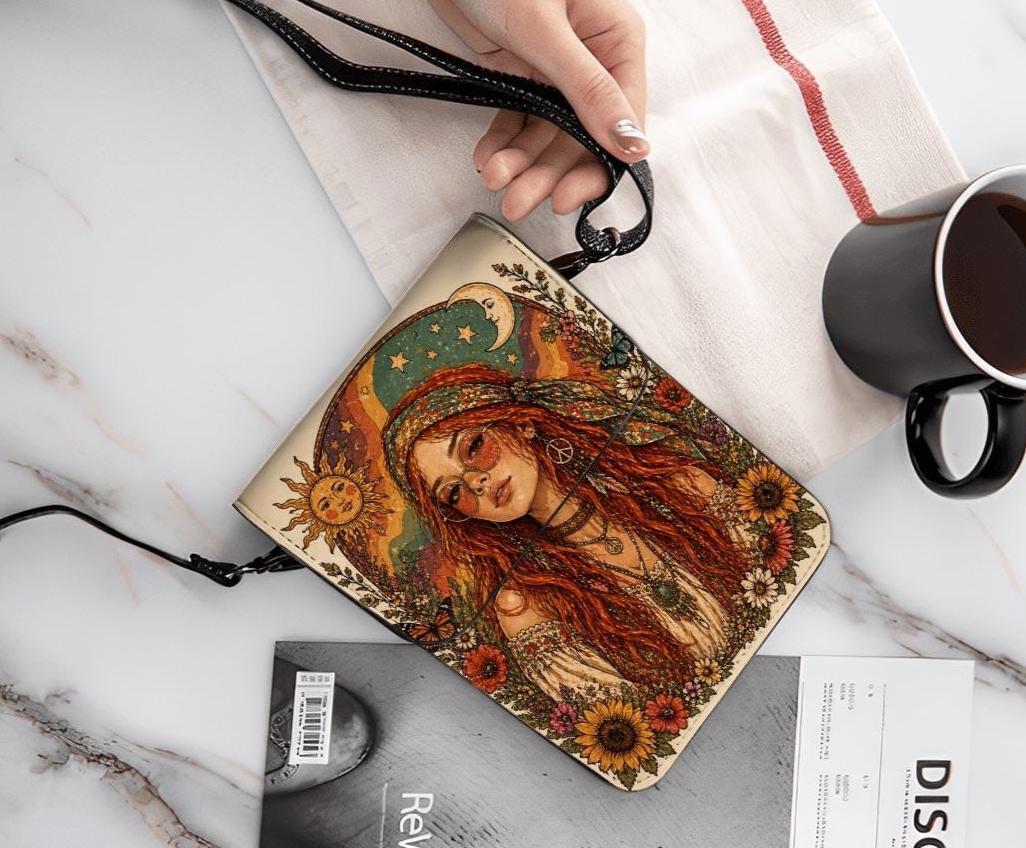 Add earthy bohemian charm to your everyday style with this boho sunflower phone purse, featuring a beautiful celestial-inspired woman surrounded by warm sunflowers, sun and moon details, and rich autumn-toned artwork. Perfect for free spirits, festival lovers, and boho fashion fans.