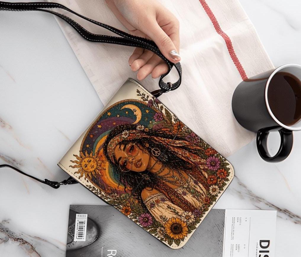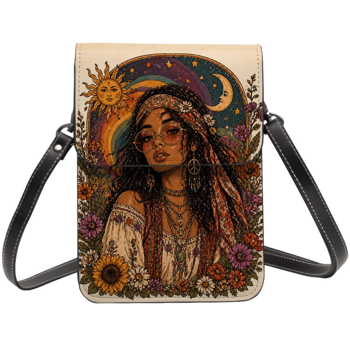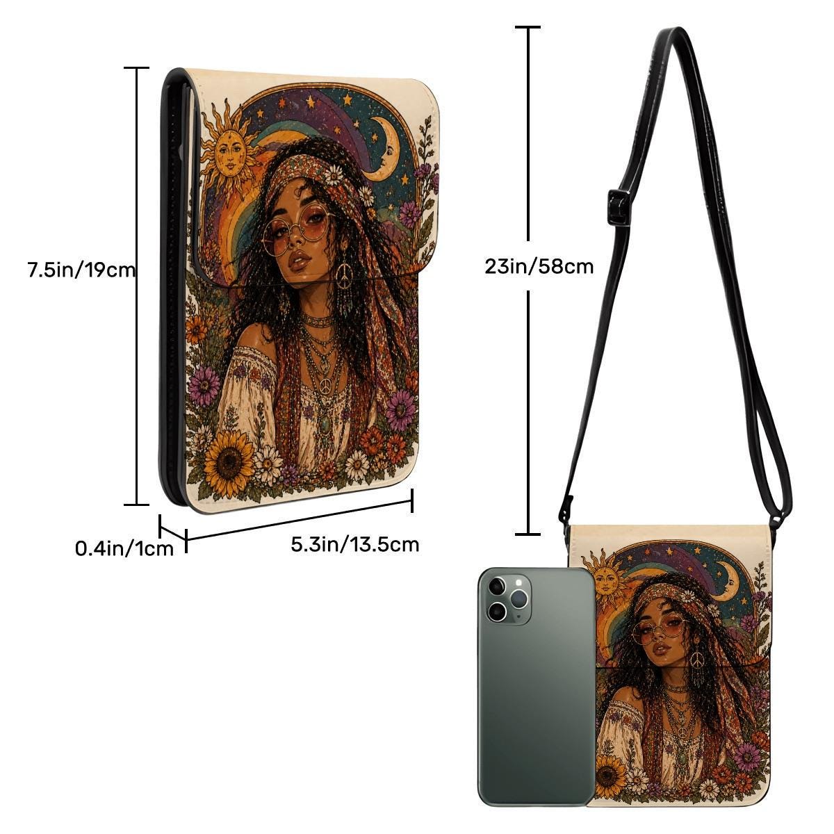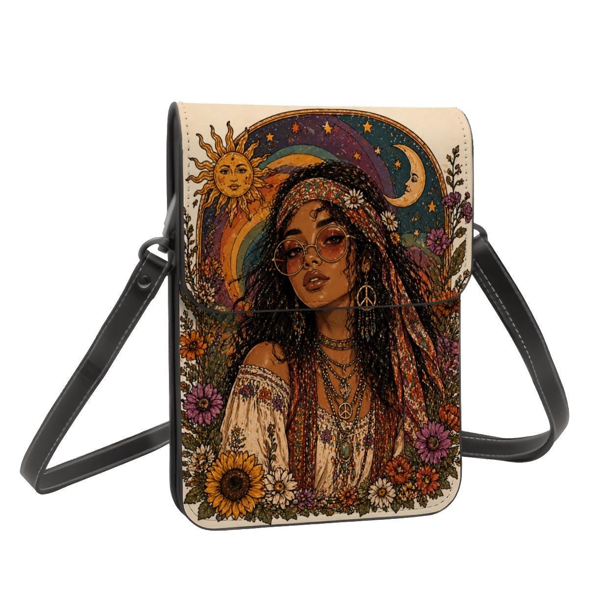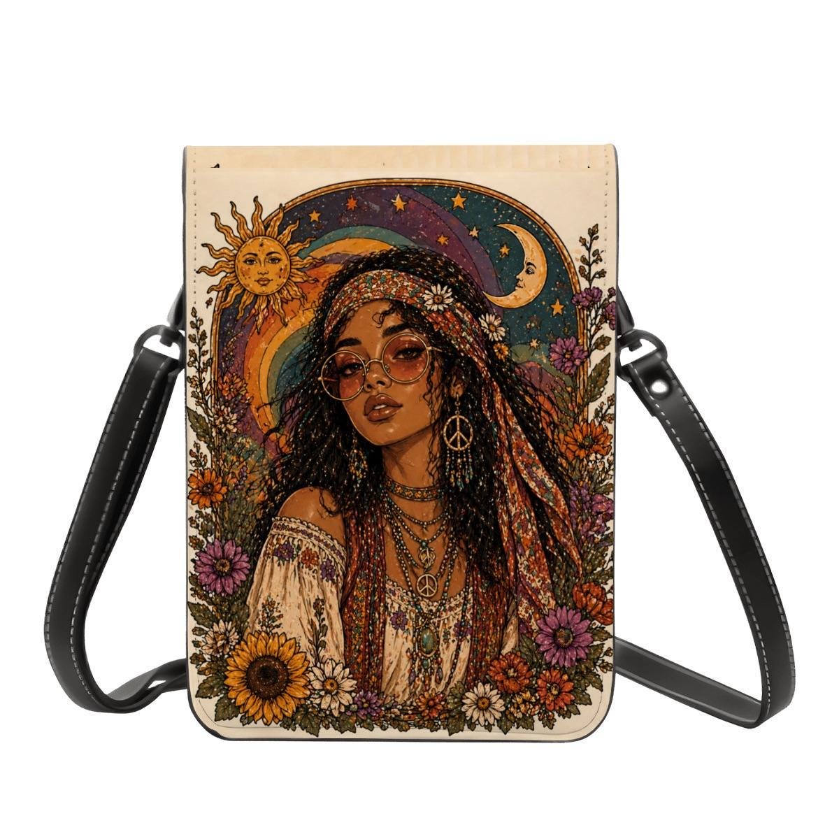Channel free-spirited energy with this mystical boho phone purse, featuring a beautiful celestial-inspired woman surrounded by moon, sun, rainbow arch, florals, and rich bohemian details. Designed for spiritual souls, moon lovers, and boho fashion fans who love expressive artistic accessories.