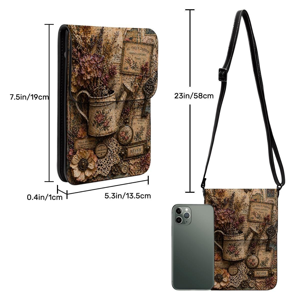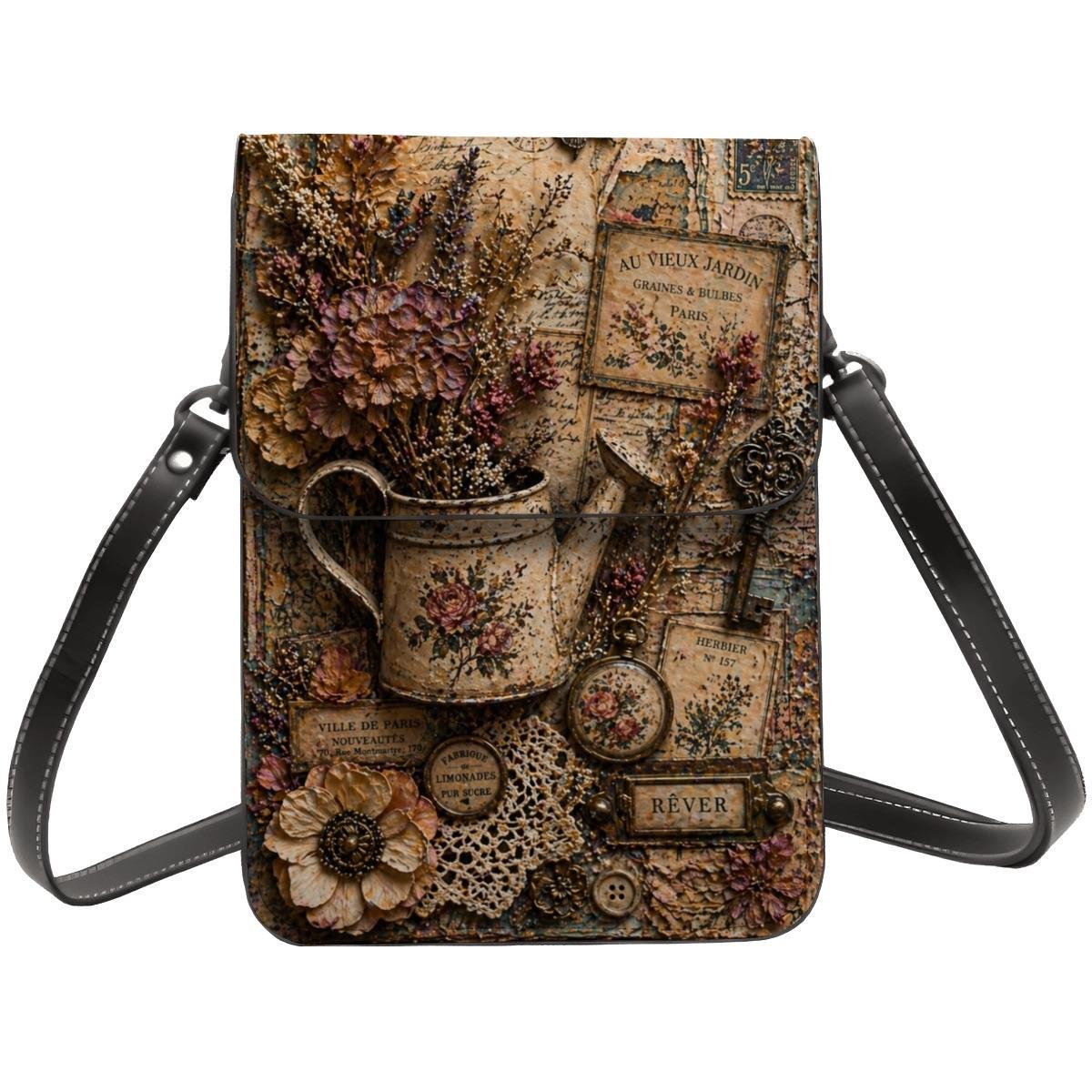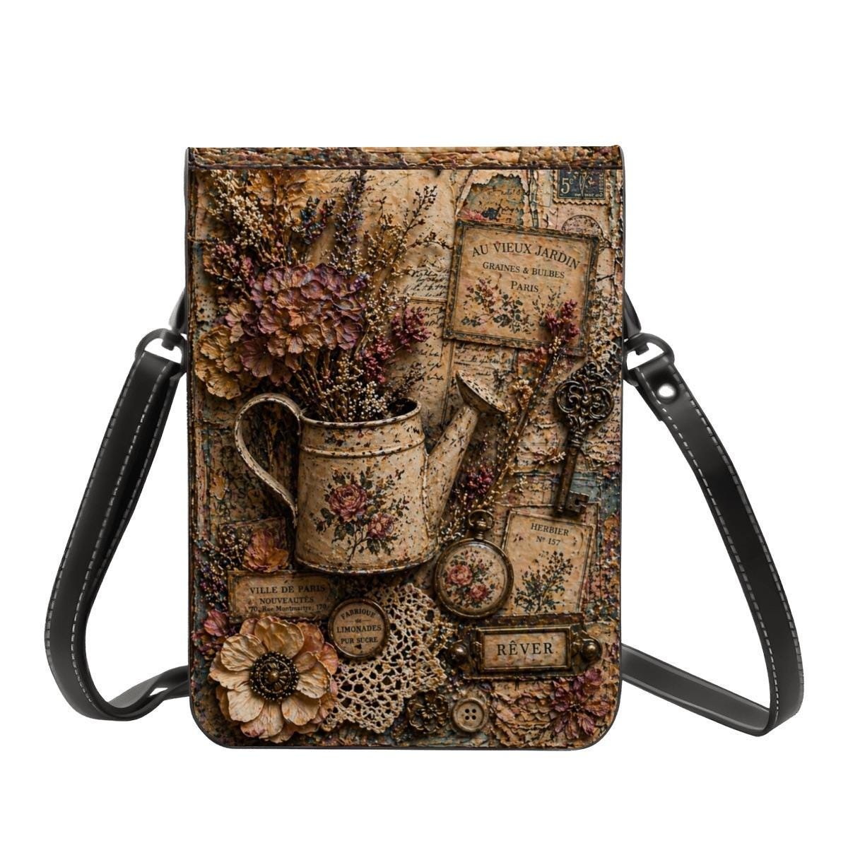 Carry timeless vintage charm with this beautifully detailed floral phone purse, featuring antique-inspired floral artwork, rustic textures, and shabby chic botanical styling for a romantic feminine look.