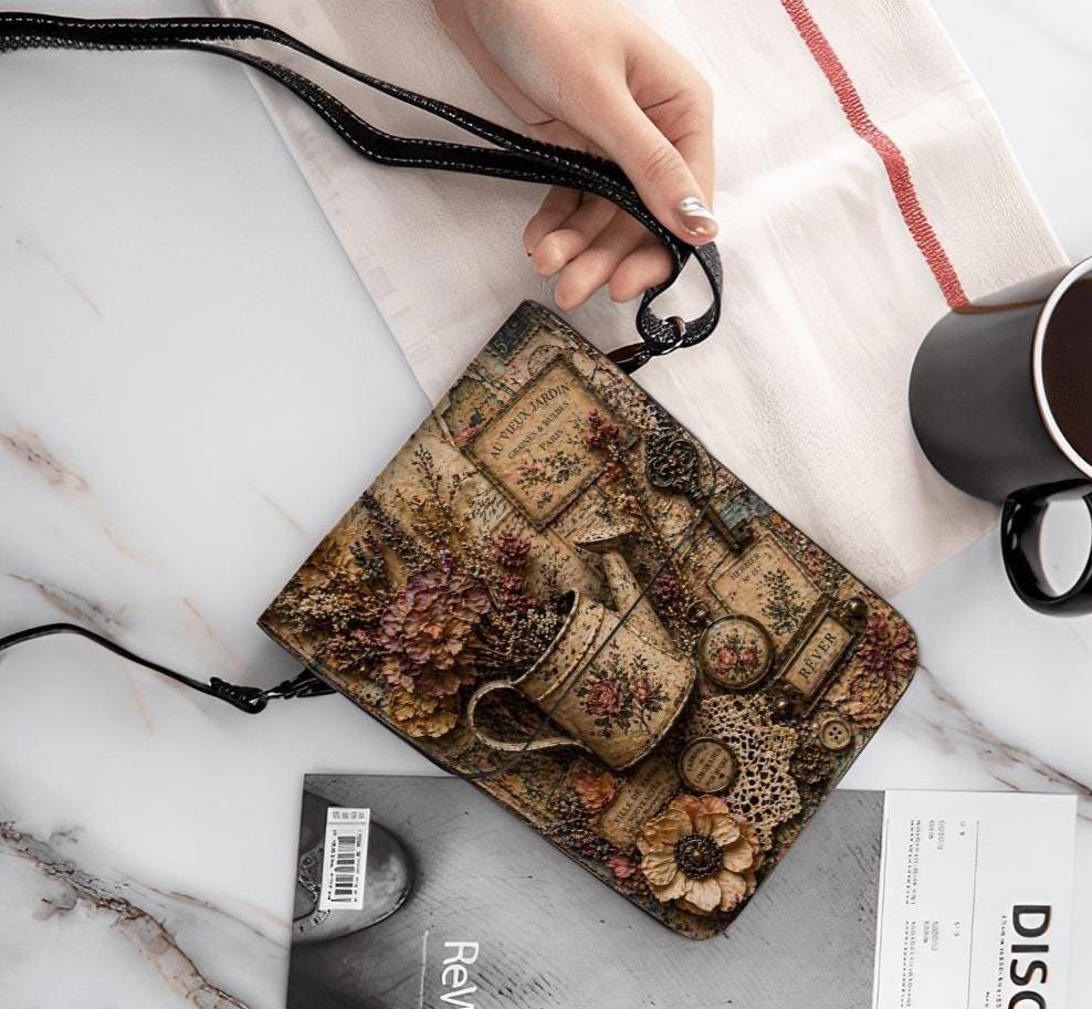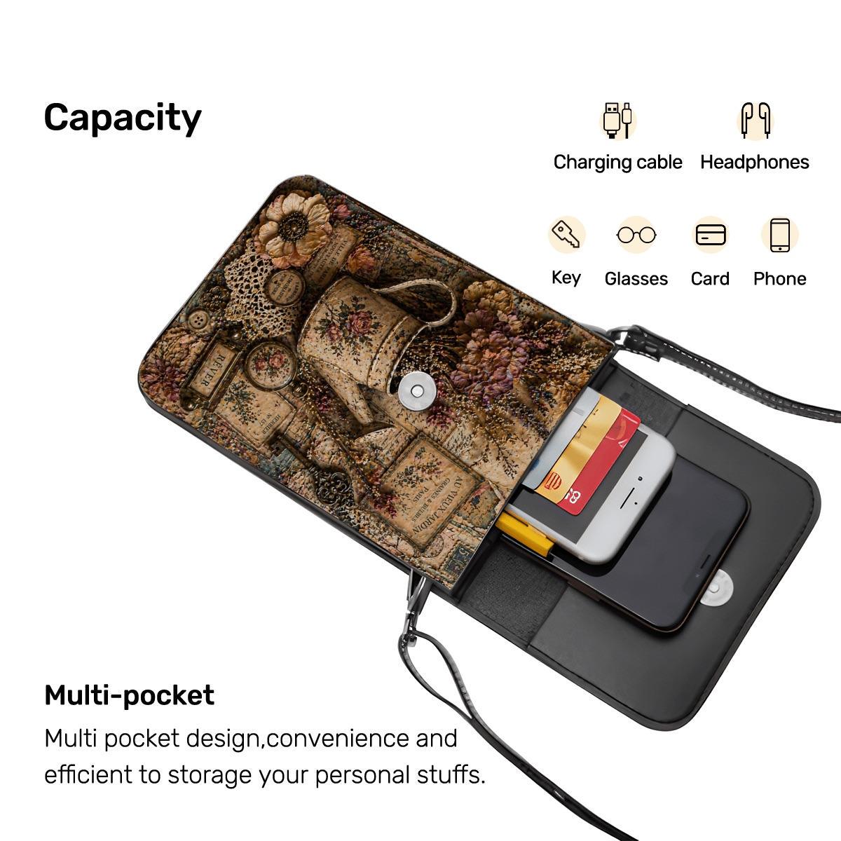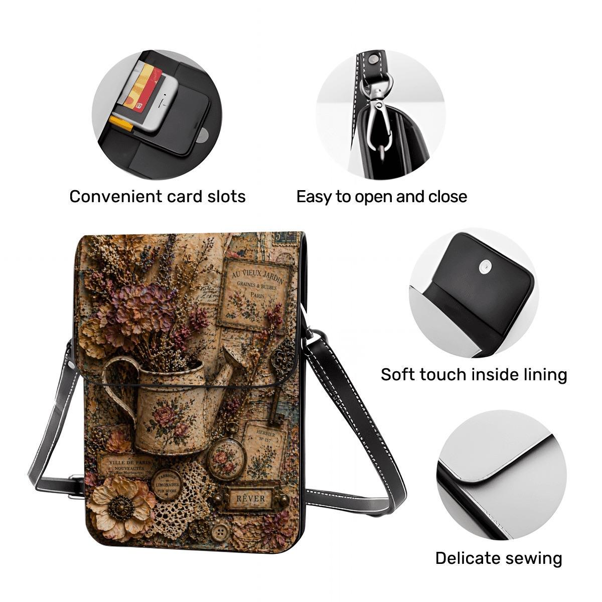 Carry timeless vintage charm with this beautifully detailed floral phone purse, featuring antique-inspired floral artwork, rustic textures, and shabby chic botanical styling for a romantic feminine look.