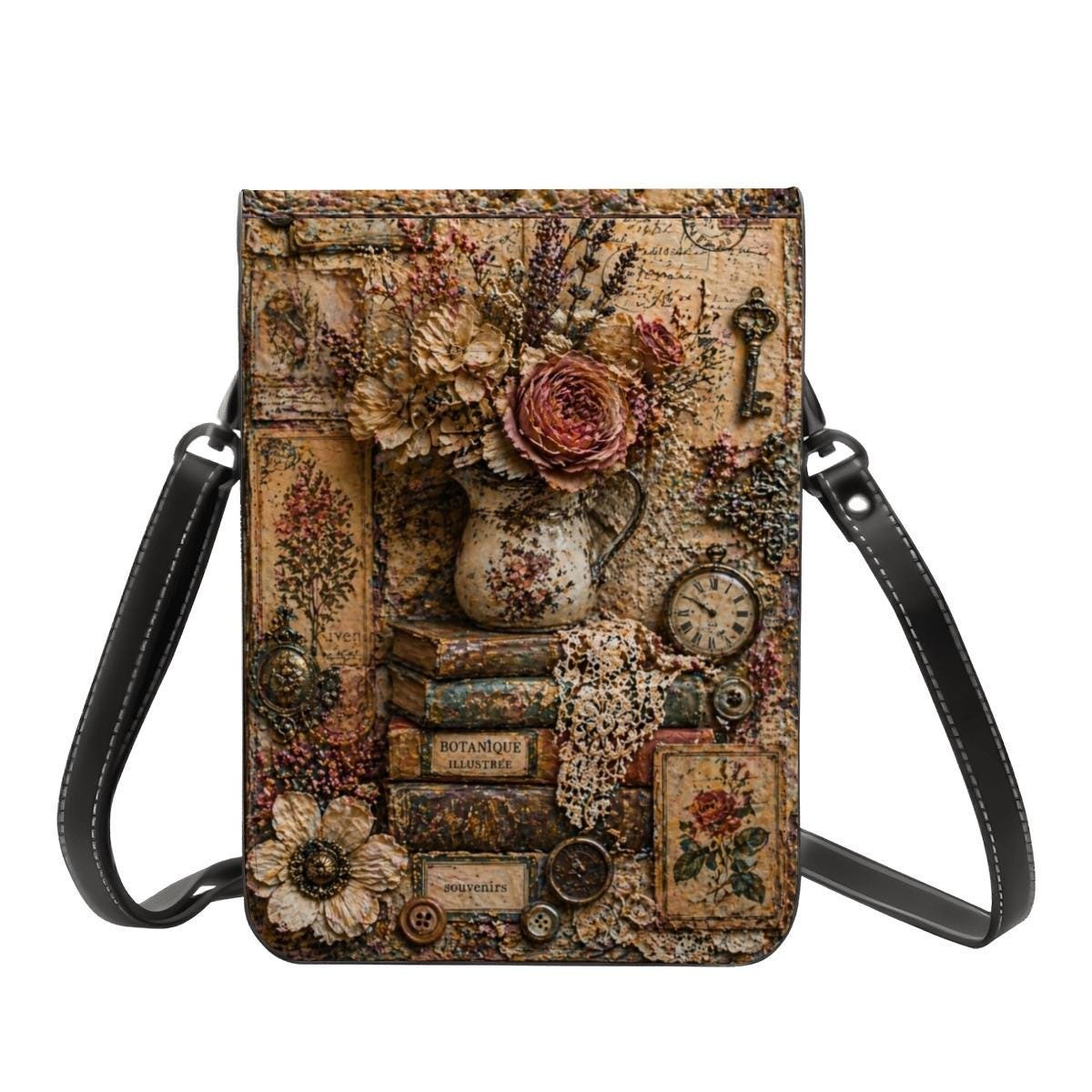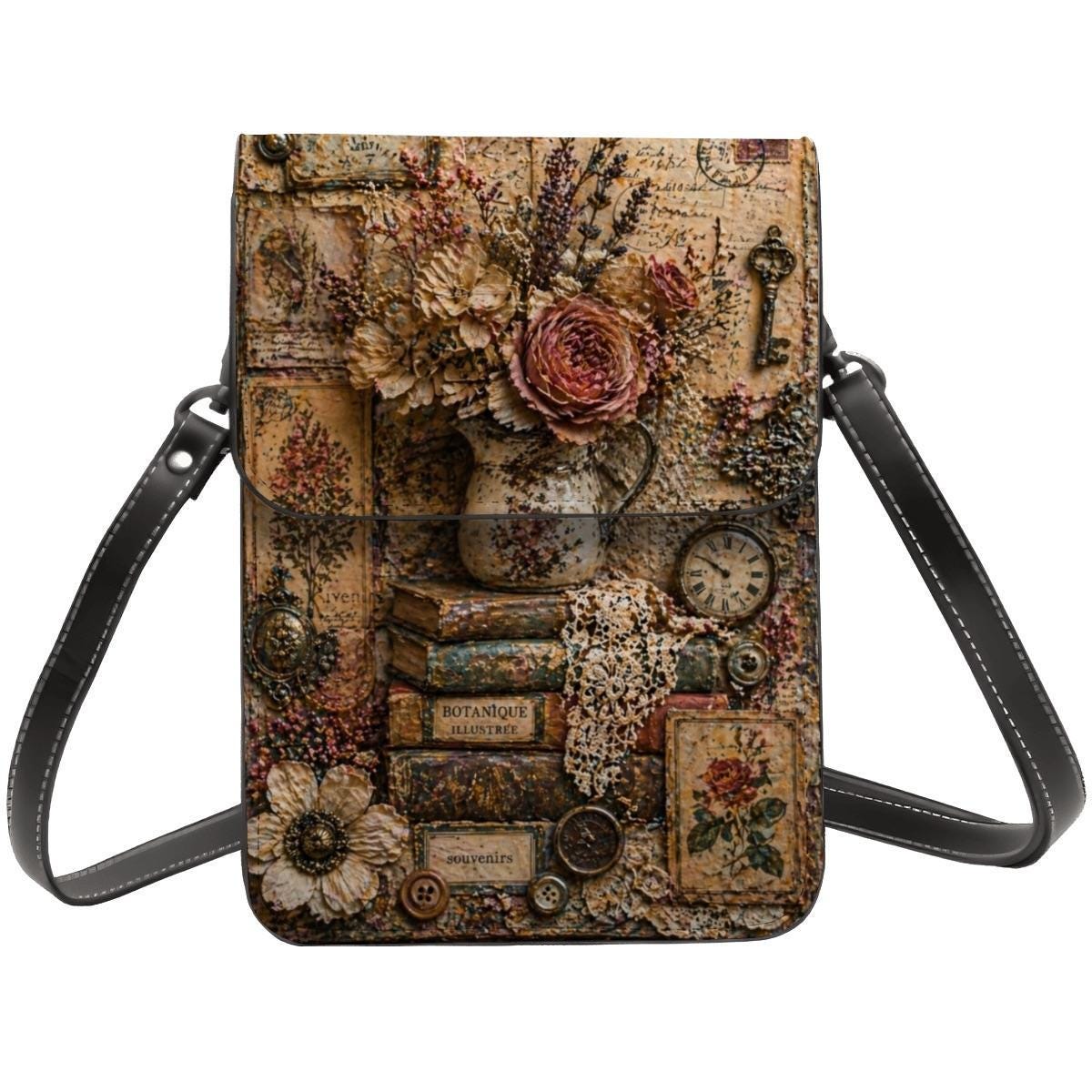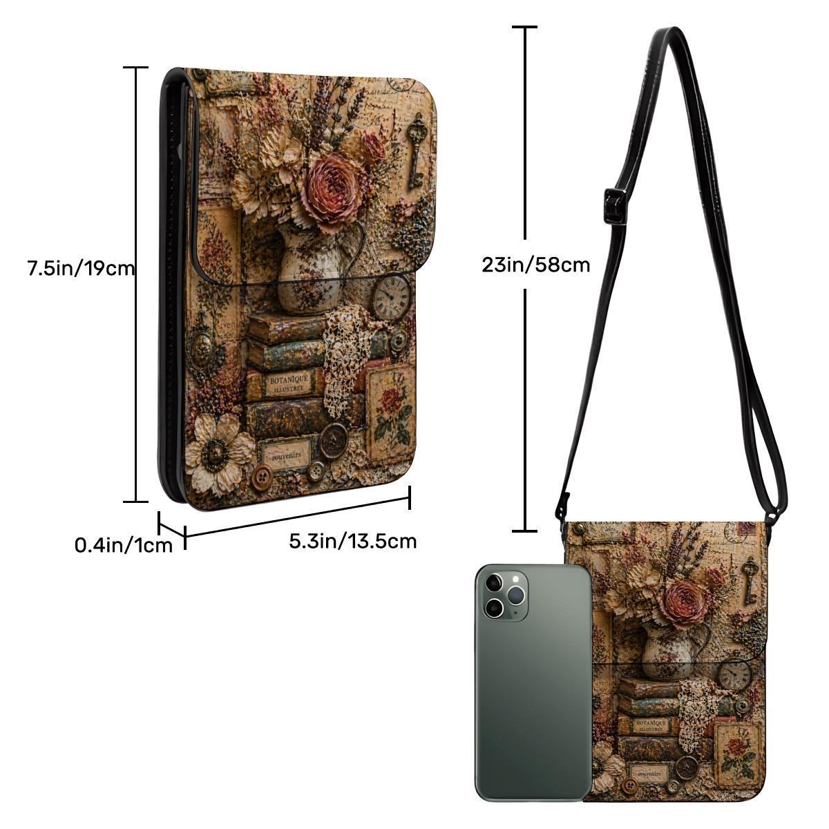 Carry timeless vintage charm wherever you go with this beautifully detailed floral collage phone purse, featuring antique books, romantic flowers, vintage keys, lace accents, and botanical ephemera in a rich shabby chic aesthetic.