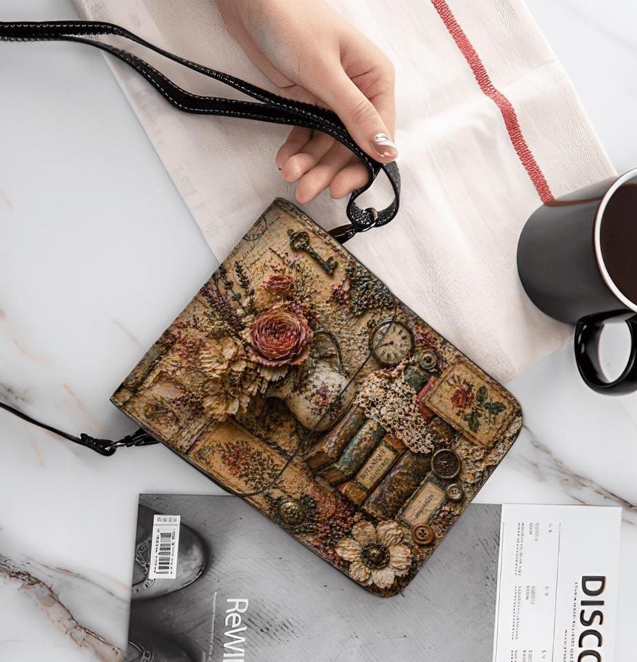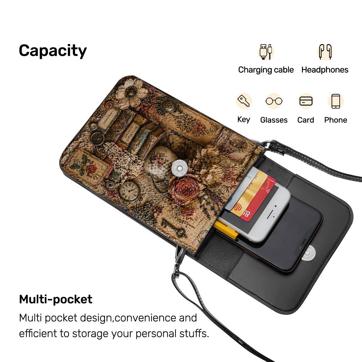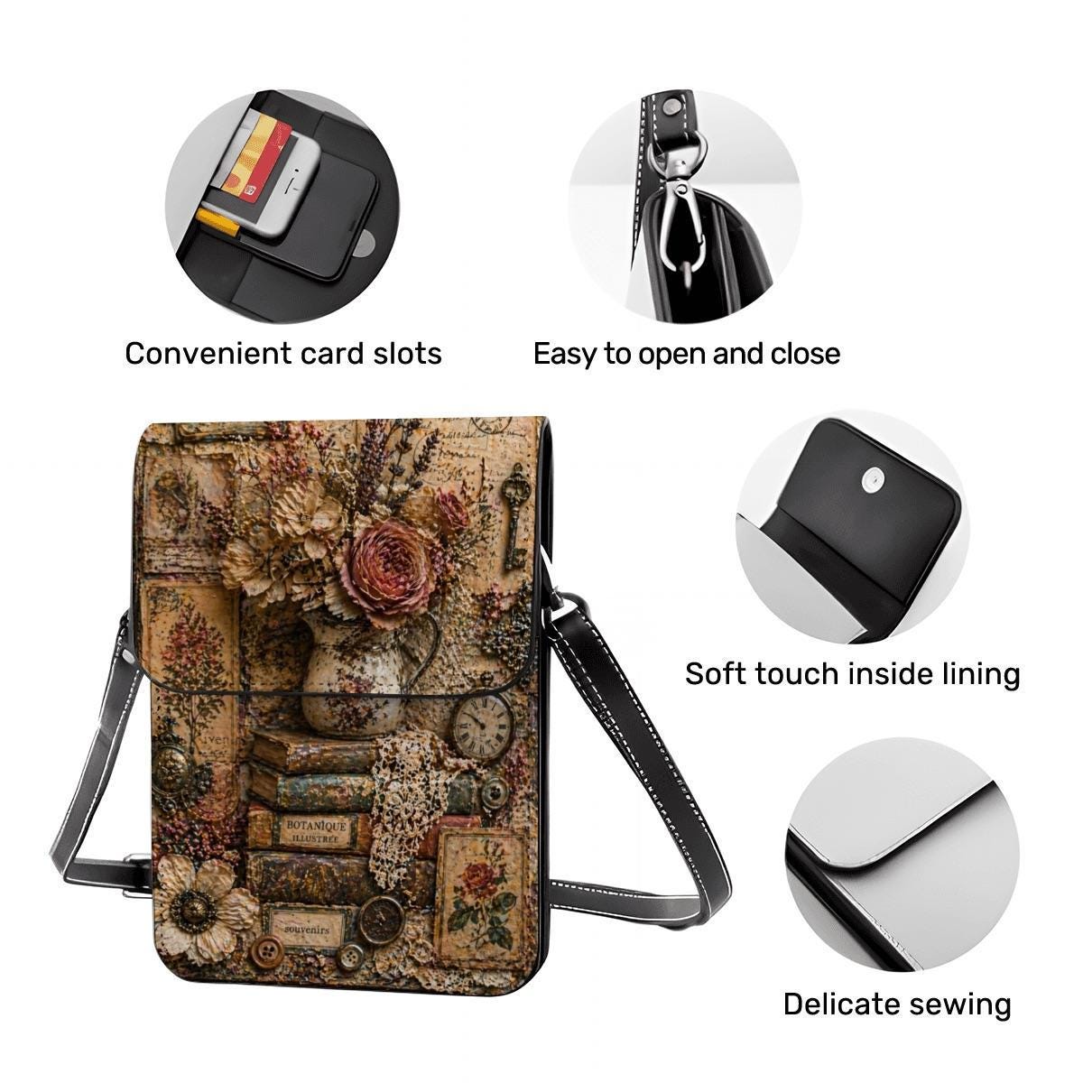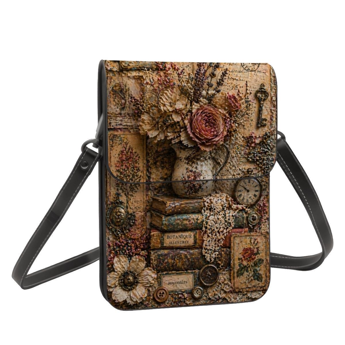 Carry timeless vintage charm wherever you go with this beautifully detailed floral collage phone purse, featuring antique books, romantic flowers, vintage keys, lace accents, and botanical ephemera in a rich shabby chic aesthetic.